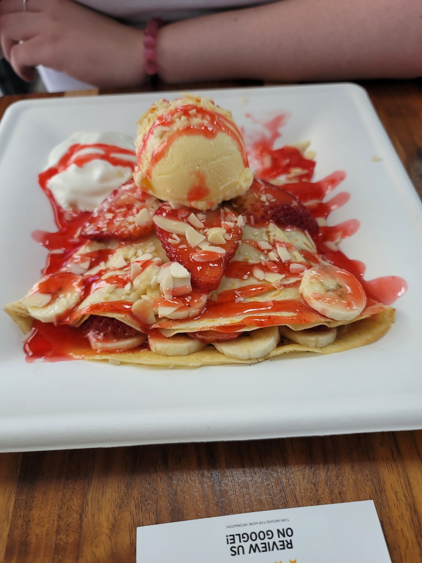 Read moreTerrible food. Terrible service. Terrible drinks.. Not genuine crepes. It's flat pancakes. Mostly flour. Not true French crepes but more like IHOP crepes. We ordered 4 crepes. 2 savory, 2 sweet. A unsweetened tea and 2 Caramel frappes. There was no Carmel in either Caramel Frappes! And no one was at the service counter the entire hour we were there. Tables sat with dirty plates from earlier customers the entire time. First the QR code ordering system is terrible. It takes longer and too many steps with you having to hand input your card # and gather everyone's order at your table. It took 50 minutes to get our food with only one to-go order before us. I was given VERY sweet tea but their online menu says that only serve UNsweetened tea. They said they only serve sweet tea when we finally were able to say anything to a worker. They did not return my money when I opted for water but instead gave me 2 mini water bottles they charge just $0.49 for. Then the crepes:, they only brought out 2 crepes and 2 others at the table had to watch us eat as they waited another 15 minutes for theirs. 2 of the crepes were pretty much raw. One Not fully cooked on the inside folds and the other savory crepe just wasn't cooked well at all inside and out. It was very doughy. The cook forgot to add an ingredient during cooking so after we began eating brought the ingredient to our table for us to add. But it's meant to be warmed inside the crepe as it cooks, not served cold . Overall extremely disappointed. Oh and a sign in the bathroom asks the customers to scrub out their toilet for them. Not worth it for the...
