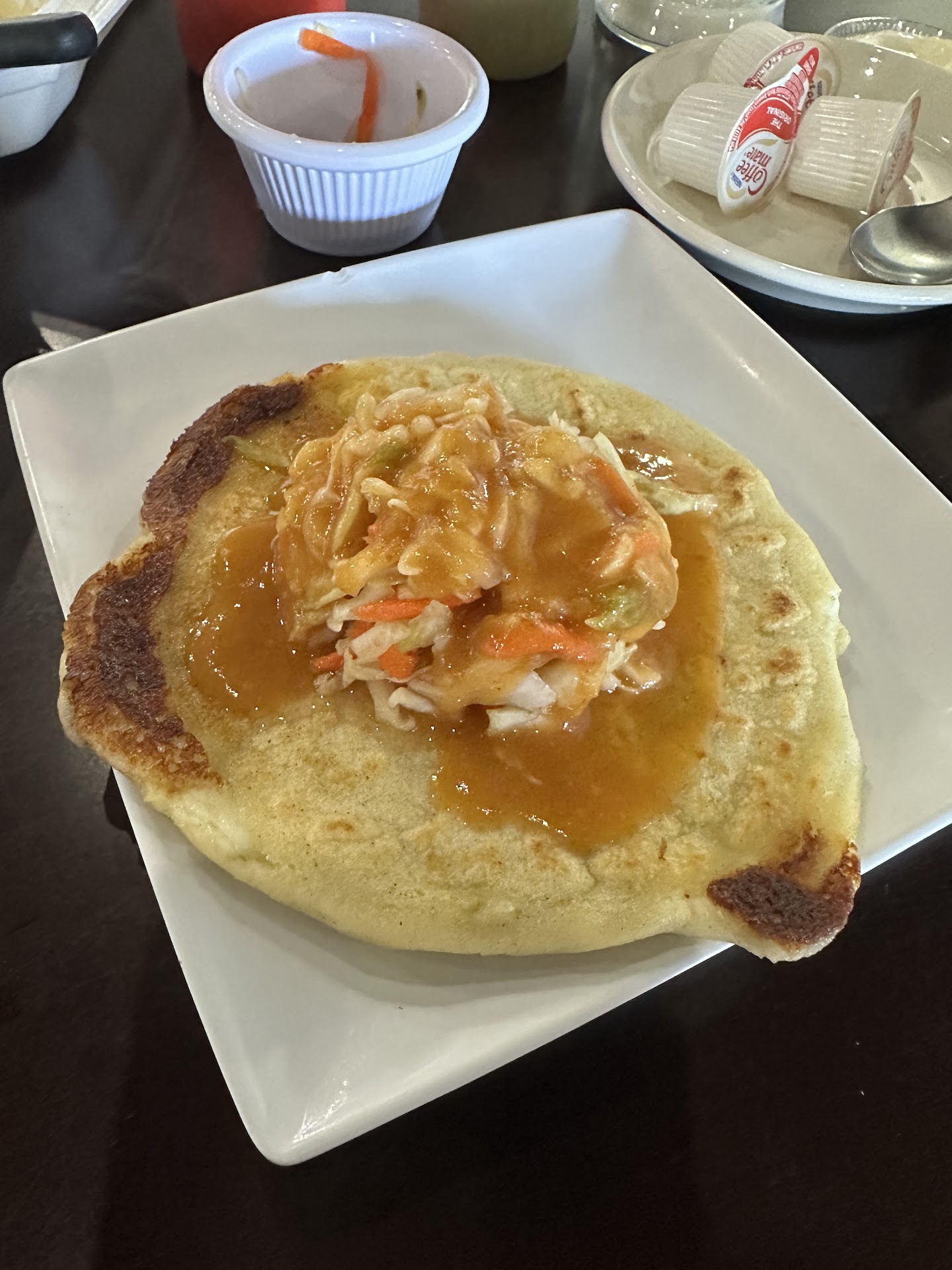 When we got there the place was empty. I think they're understaffed, which might partly explain our experience. It was our first time there so we ordered the sampler platter. We waited quite awhile, which didn't bother us, but while we waited around a dozen other customers came in, and all of them had to wait a long time to be waited on. A couple of them had called in orders and by the time they got there their food hadn't been started. One lady asked for a refund and was told to just wait. I ordered the Jamaica to drink which tasted great - a little tangy and not too sweet. My wife ordered the Horchata and gagged when she tried it. I tried it and I have to agree, it was really awful - very bitter with a taste like scalded beans and burnt styrofoam. My wife told the gal at the counter that she thought something was wrong with it, and her reply was, "No, that's always how it tastes." Maybe it's a unique Salvadoran thing, but if you like Mexican style Horchata, don't go near this toxic brew. When we got our food we were pleased with it. This is not light fare - very filling and savory. The pork was a little tough and chewy but tasted great. We especially liked the empanada. We had ordered a side of beans and cheese and it never came. When I went to the counter and said, "We ordered beans but never got them," she said "Ok" but never brought the beans. For the first 15 minutes it was very quiet in the restaurant, but then someone in the kitchen turned on some Spanish language music and sang - actually yelled - along with the music at the top of her lungs. Occasionally the hostess would go back there and join her in yelling out the music. At first it was funny and we all laughed about it. By the 7th and 8th song we were all convinced that someone in the kitchen was really drunk and I was ready to get some ear plugs. When it was time to pay, She had charged us for the beans and an extra pupusa. When we reminded her that we never got the beans, she removed that charge. When we told her we didn't order an extra pupusa, she said, "well, you got one" and still charged us for it. If we're ever in the mood for Salvadoran food again we might order some takeout from here and check our order carefully before we pay, but we won't ever dine...