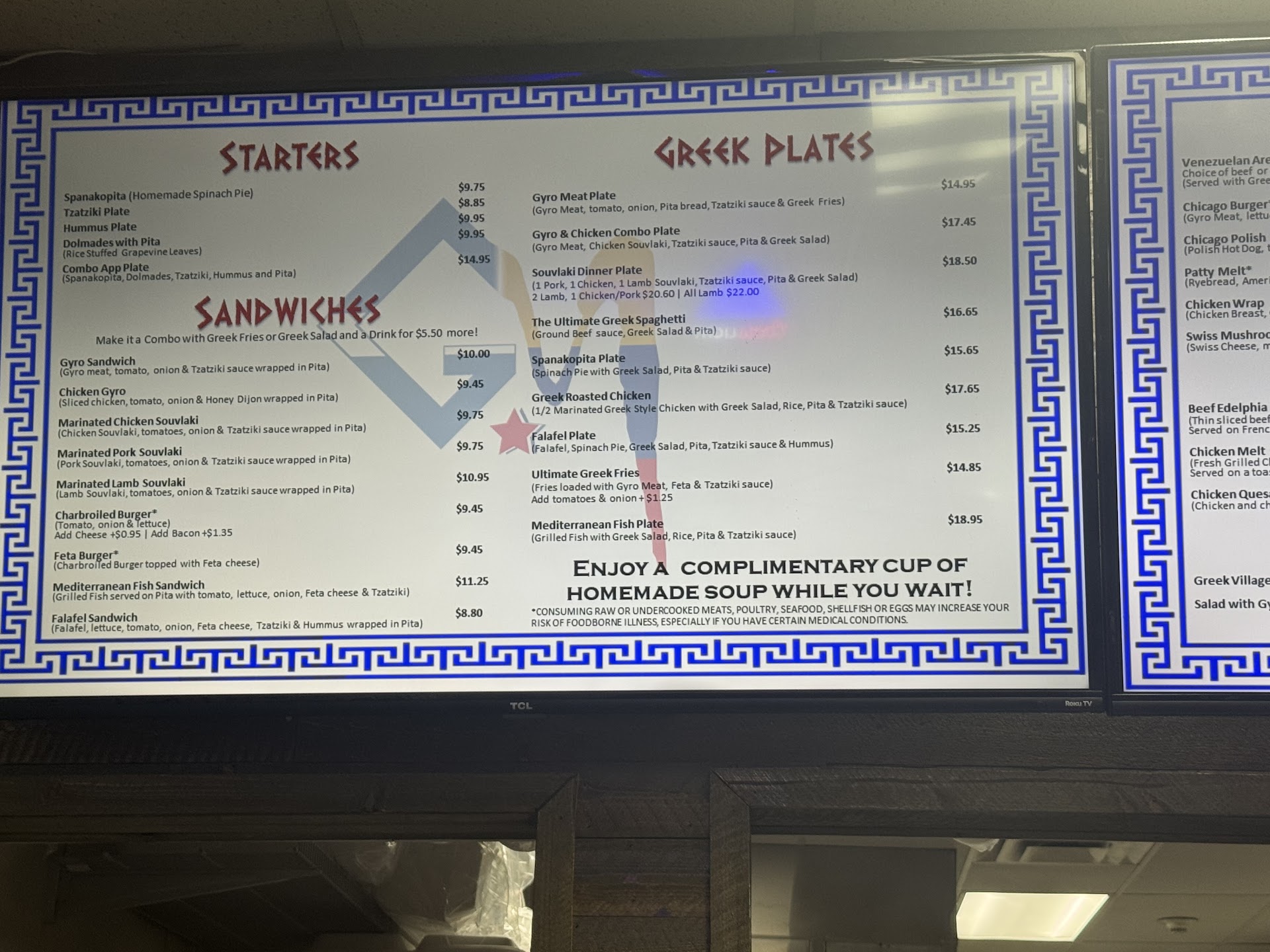 Read moreThis is a family run business. From the moment you walk in the door you feel welcome by whoever is working. The two brothers are usually the ones I see when I'm in. Always willing to help and answer questions. After you order your food, they give you a bowl where you can help yourself to hot, fresh lentil soup or lemon chicken rice soup while you wait for your order. The gyro sandwich with the greek fries and the drink is my go to order although I occasionally try other things on the menu. For a small fee of I believe .35 you can add Feta cheese to the gyro which I recommend. The greek fries are just fries sprinkled with feta cheese. If you like french fries, you will love them. You get a nice size portion. The gyro also is a nice size. Its got a nice portion of meat as well as tomatoes, onions, and tzatziki sauce. They also offer desserts for those with a sweet tooth. I definately recommend trying out this restaurant and enjoying a hot fresh gyro. Its one of my favorite places to eat. And if you have a Military I.D., be sure to show it because they will honor your service...
