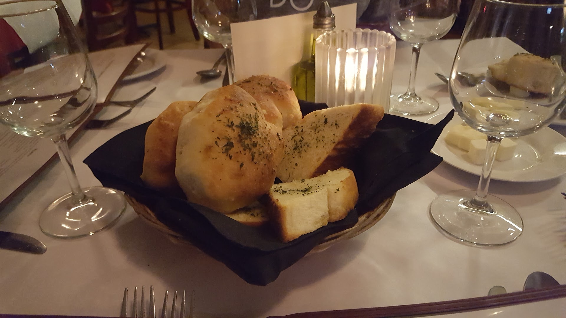 They are listed as a moderately priced facility, noticibly striving for the intimate setting yet they have a television hanging from the wall like a sports bar which is tacky, while selling glasses of white wine at $10 / glass as if they are a classy 5 star restaurant. Last time I checked, places of their caliber charge $5 to $7 / glass. Then a bottle of Moscato was $32 (that's a joke knowing that Moscato runs at most $26 / bottle at high end restaurants and only $5 to $15 retail). Background music was playing originally when we arrived, but 15 minutes in, and the music was off and all you heard was sounds of the kitchen and neighboring tables conversations.