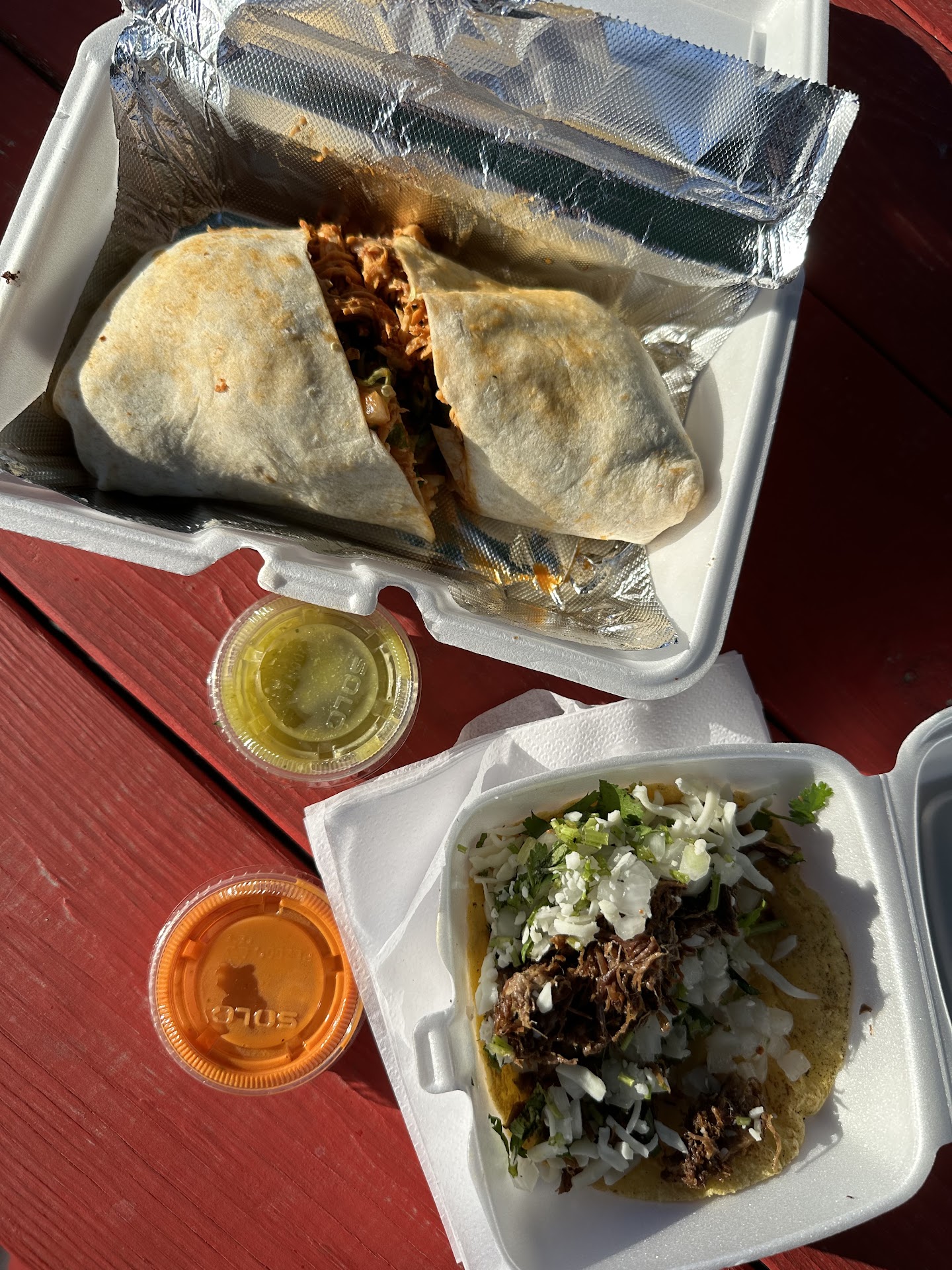 I spotted this food truck on the side of the road and decided to give it a try. Even though it only had a couple of reviews, I figured I’d see for myself. I don’t speak Spanish, so there was a bit of a language barrier at first, but the lady running the truck was super helpful. We used Google Translate, and it worked out just fine. I ordered a chicken burrito, and while it was a little on the cool side, the filling was packed with juicy seasoned shredded chicken, lettuce, beans, cheese, and onions. The flavor was really good and had a nice kick. I also got a single beef barbacoa taco with cilantro and onions on a corn tortilla, and it was awesome. The crispy onions on top and dipping it in their green and red sauces really hit the spot. There are a few benches to sit on and plenty of parking around, so it’s a pretty chill setup. I’ll...