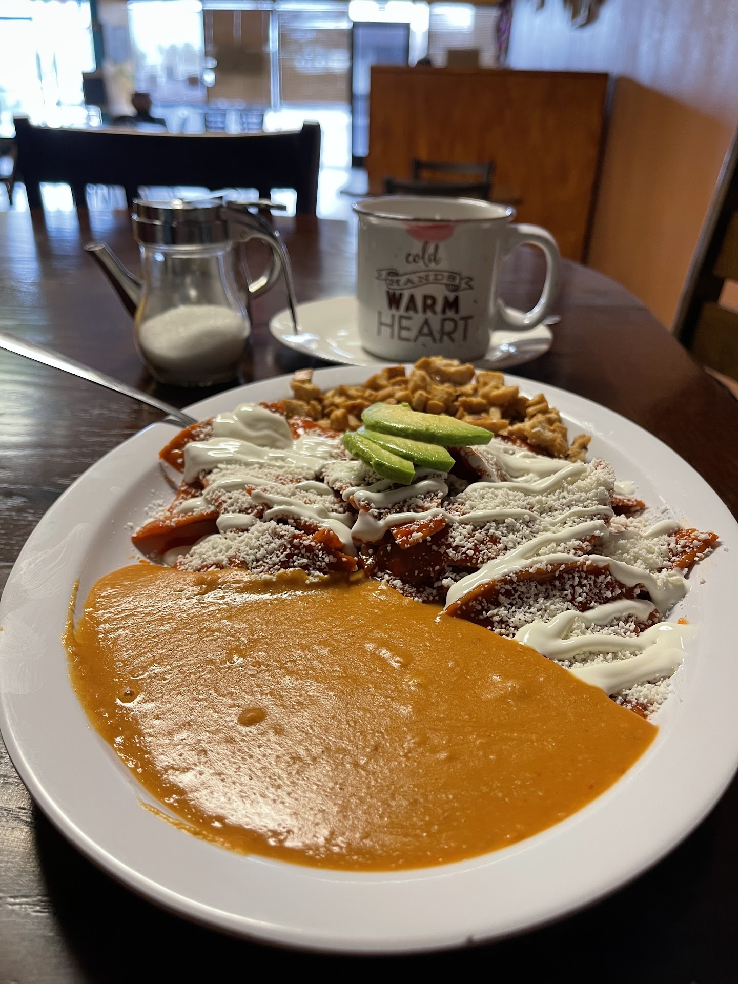 Read moreLooking for Mexican breakfast on Google Maps, we found this restaurant. The reviews were positive so we decided to give it a try. We were not disappointed! It is a small place, not fancy but full of good vibes and great service. Marena greeted us upon arrival and let us choose where to sit. We ordered 2 coffees right away and they promptly came, in a big mug and with the notice from Marena that she was already making more, just in case we wanted some. Glancing over the menu I quickly spotted some Huevos Rancheros and decided on them. My wife went with the Chilaquiles w/Chicken. Both were great!!! The refried beans w/pork were both a first for us and a very tasty complement to both dishes. My wife Chilaquiles were awesome, not smothered in sauce like other places, crispy and tasty as well as the chicken in them.