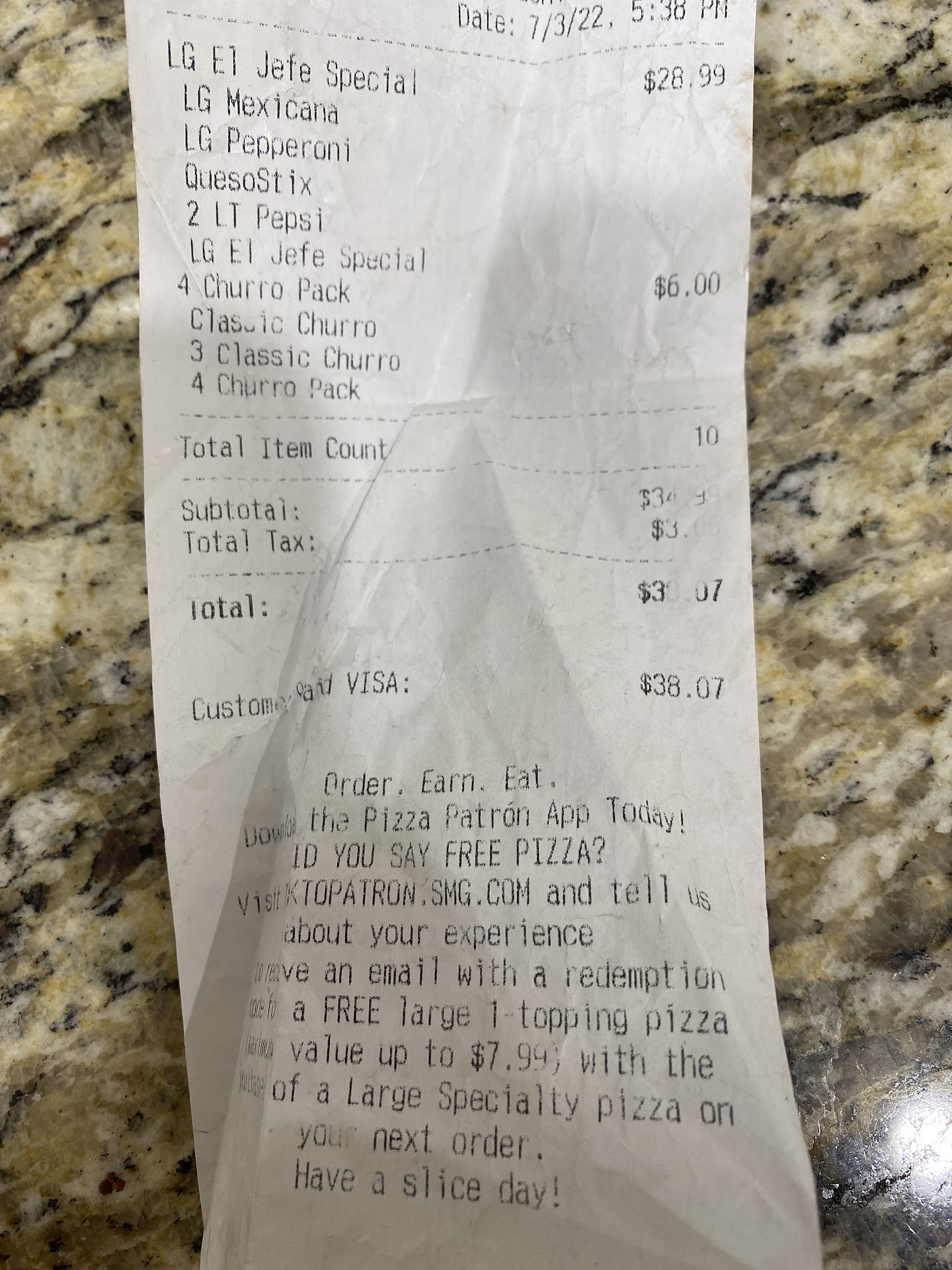 Read moreIn the beginning of the month I came here to order the Jefe special. When getting the order it all seemed to be correct. guess on the one hand I should've checked if it was indeed correct. I got home and realized it was chicken Alfredo pizzas Now coming home and giving that to teenagers you can only imagine. No one wanted to eat that. I called and I spoke to Dylan which said he was so sorry and honestly had great customer service. Due to the fact that I don't live close he said I would be refunded. I called two days later and spoke to a Douglas I got some attitude and he stated he wouldn't be able to refund me unless I showed up. I work full time and have to deal with my own things I can't just show up whenever they want me to. I hope when I am able to go they'll respect what they said and still refund me. I used to love pizza patron but seeing the reviews I...