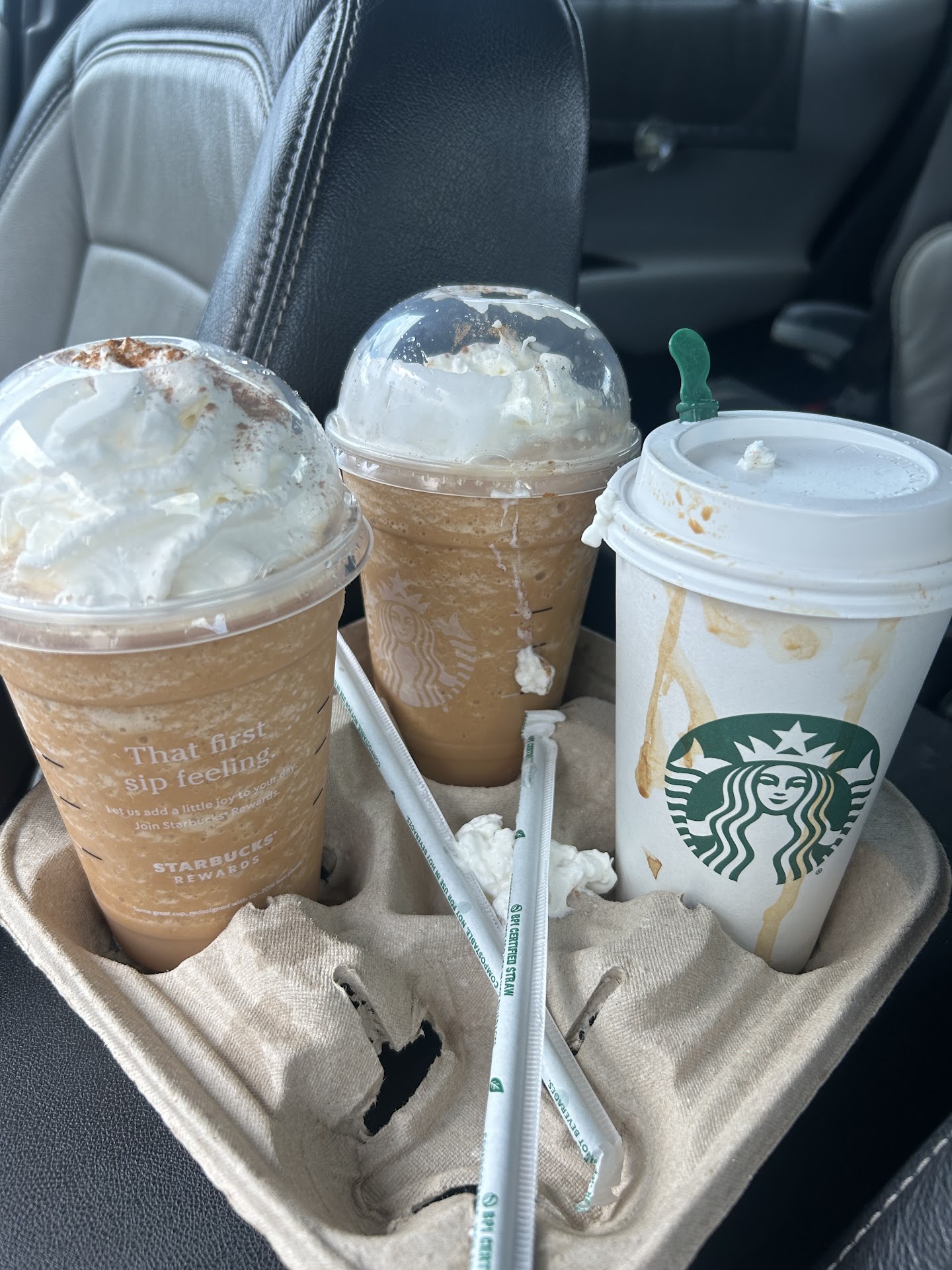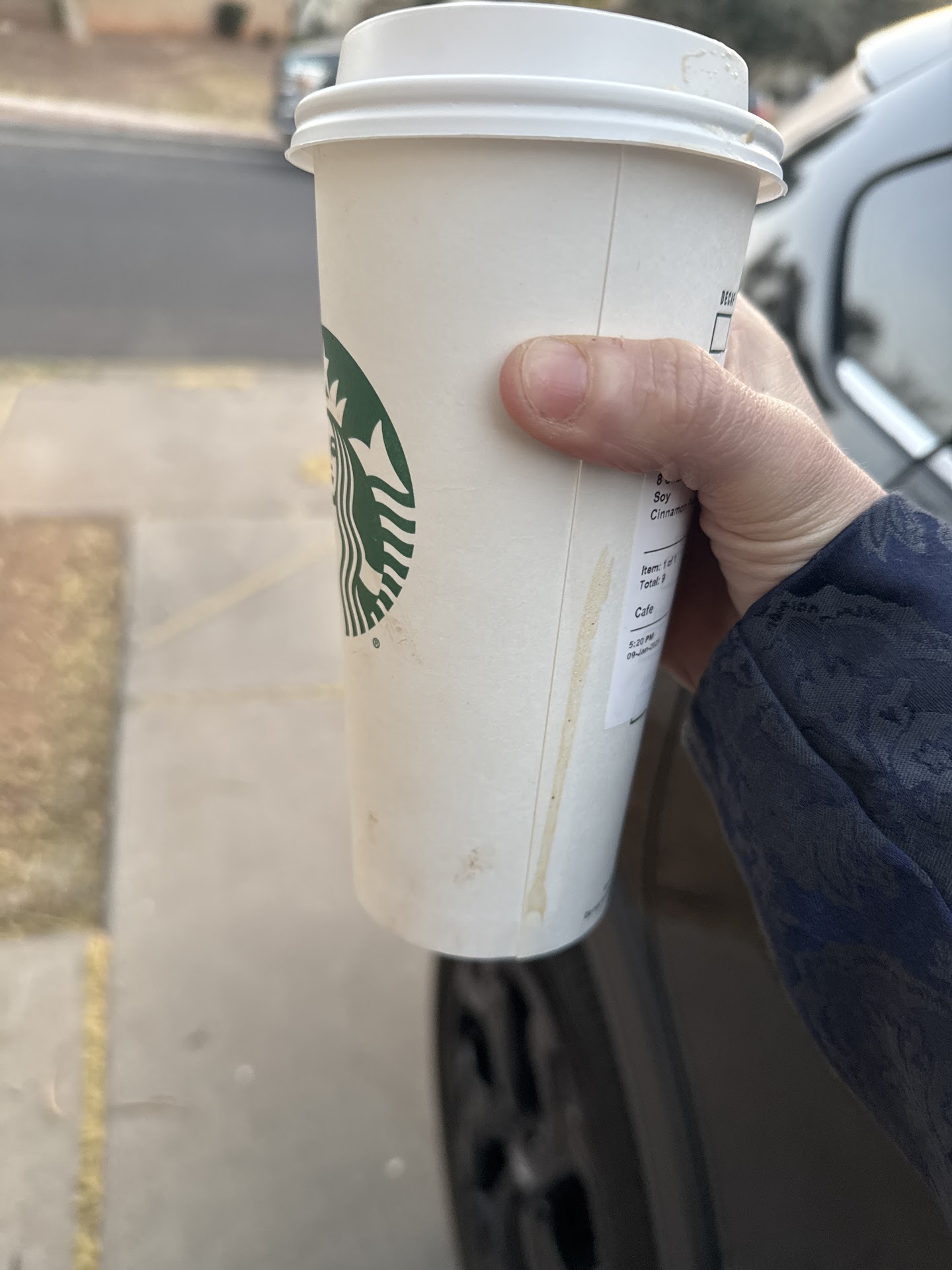 Read moreCame in to get some cake pops and a hot chai they call my name and there is just a bag no drink so I ask “hey is my drink still coming” the girl behind the counter says “shit I forgot” and starts quickly making it, a few minutes later puts the cup on the counter it looks fine I take a sip and it is ice cold, so I say “hey this is cold it’s supposed to be hot” and it was in the hot cup. She grabs the cup pours it into a large metal cup to warm it, and says “here…my bad” was horrible customer service I felt like an inconvenience and like wanting what I ordered was too much but if I’m spending almost $50 on only a few things they should be right. What a bad experience I go to this Starbucks daily, the morning crew is MUCH better than evening. Also no cozies for hot...