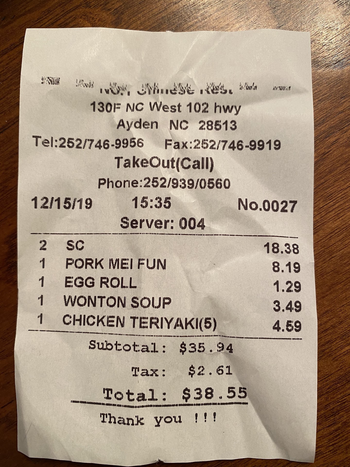 Read moreWill not be returning. Fist of all I agree with all the other reviews about the cashier, poor customer service and talks whisper quiet across plexi glass divider. Ordered a variety of food, about $60 worth, and the food was not worth the money at all. The quality of food was bad, some tasted and looked old. I've worked in a handful of Chinese restaurants and never had food that looked and tasted this bad. Don't get me wrong I know it's "Chinese American" food so it's not authentic by no means, but I know what fresh food tastes like and this was not it. The wontons were old in my soup, very soggy and chewy, not like they had just been out in the broth but like they had been in it the day before and microwaved. Trust me I know what reheated food tastes like. The crispy noodles that come w the soup looked like they had been made days before and then refried. The dumplings had a sour smell and again texture of them was like they were old. Egg rolls were extra greasy like they were sitting in a basket and then fried again. Believe me I know most places make the eggs rolls, fry them and then freeze or refrigerated them, and then fry when they are ordered. Could have also been an old grease problem like they don't clean the fryers like they should.. Sesame chicken same thing, just tasted old. Also like previous reviews the prices are higher. Understandable if the quality is good, but I won't go back for...