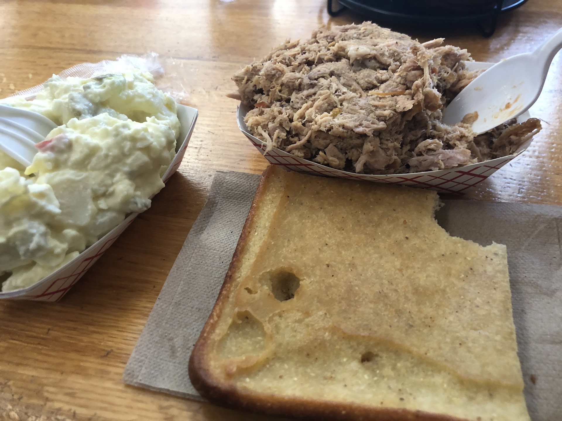 I grew up in the area, well near by and my family always loved the bbq and it still tastes fairly well, still has somewhat of the taste i remembered. The young fellas that greeted me were very nice and respectful, yes ma'am, no ma'am etc. Love that southern respect π. But I must say that the corn bread has to be the worst I've ever tasted on earth in comparison to the bbq and Slaw, its not even worthy to be on the same tray I swear. I thought over the years someone would've told them how awful it taste but nope, to date they're still using that all purpose I guess. Good otherwise but do not, I repeat, do not get the corn bread. I told my husband it was horrible but he wanted to try it anyways and of course he regretted it after 1 bite. I guess Pete Jones says they come for the meat ma'am not the bread and I say hey if it keeps making dollars I guess it keeps making cents...