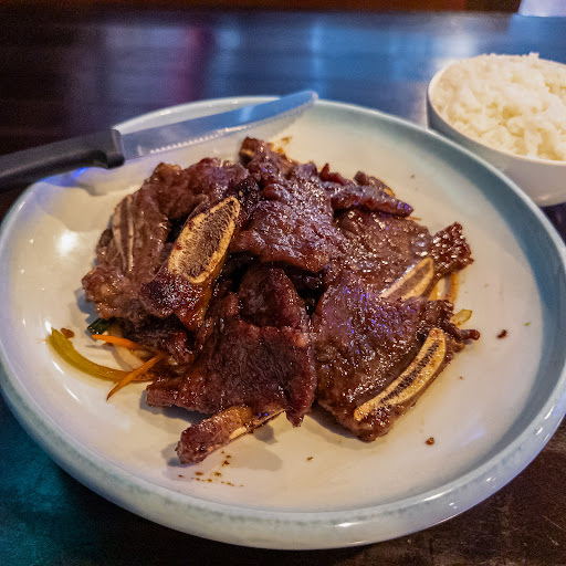 My favorite pick is the "Korean Kalbi" for $20. It's fairly expensive for most people, but the amount of kalbi you get for $20 is FANTASTIC. The meat is very tender and it is delicious. The mountain of meat rests on a ton of onions if that's your thing, and the dish comes with a bowl of rice and very helpfully a steak knife. This is my top recommendation if you have a craving for delicious beef.