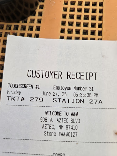 Read moreDecided to give this Aztec A & W another chance today...(been six months since my last visit when nothing went well) they didn't fail to disappoint. 6:53 PM: I pulled up, pressed the button and the first thing the young man taking the order said was, "Just to let you know, it's going to be quite a long wait because we have a lot of orders and we're behind." To which I replied, "No problem." (Mind you besides me, there were three, count em THREE cars parked outside and one had just gotten their food. And NO ONE in the dining room.) The young man didn't say anything further, so I ordered a number 3 with no onions and a diet root beer and waited.... and waited... and waited. 6:58 PM: Pressed the button again. "Hello?" No answer. Waited... 7:01 PM: Pressed the button. Waited... 7:05 PM: Pressed it a fourth time... the speaker sqauwked to life, "Sorry, for the wait. Can I take your order?" As it was approaching 15 minutes and they hadn't even taken my order, I just said, "Never mind." And left. I'm so bummed out about this A&W. That was my spot back in the day! Well, I guess I'll put em back on the "Avoid" list for...