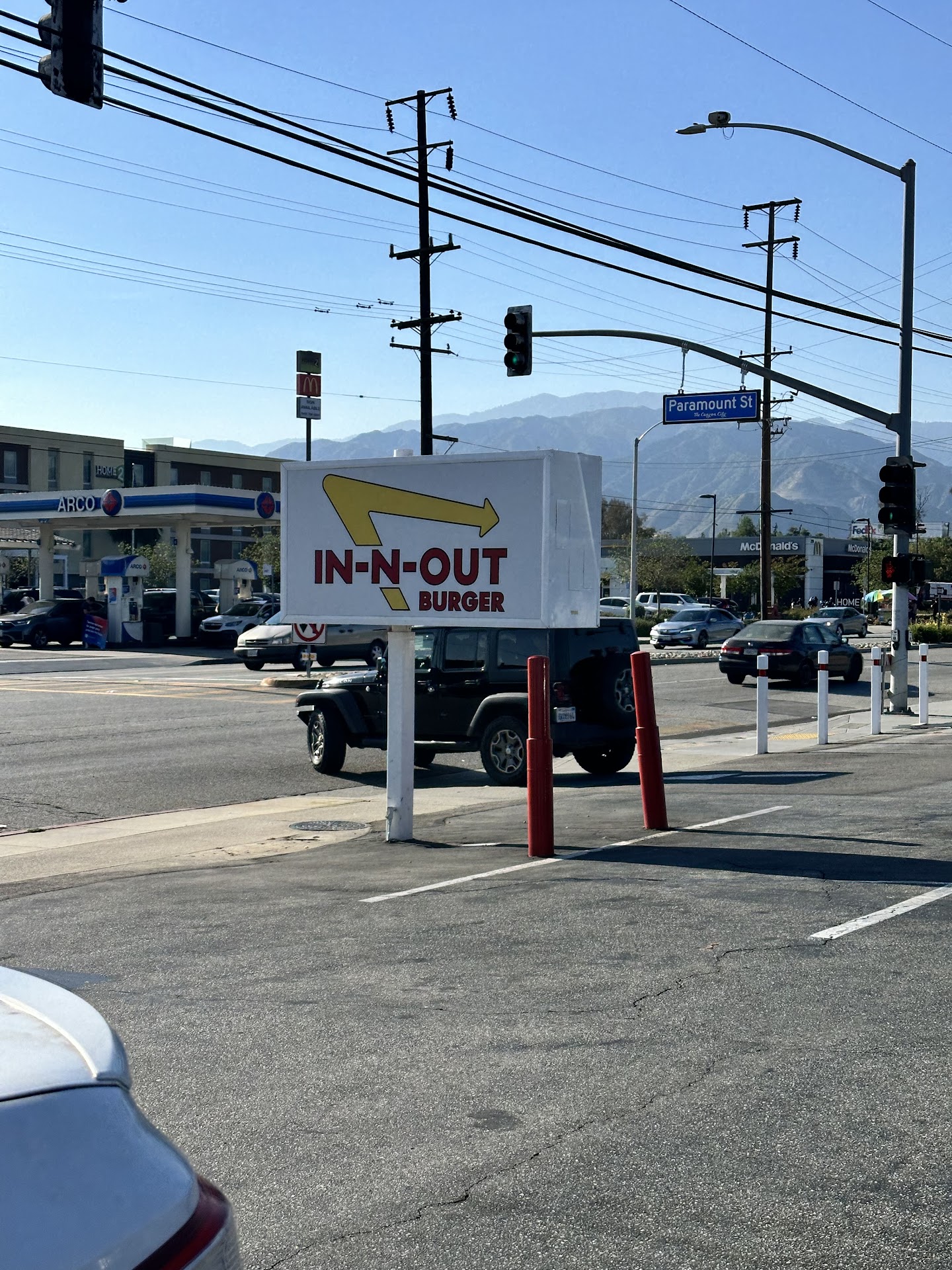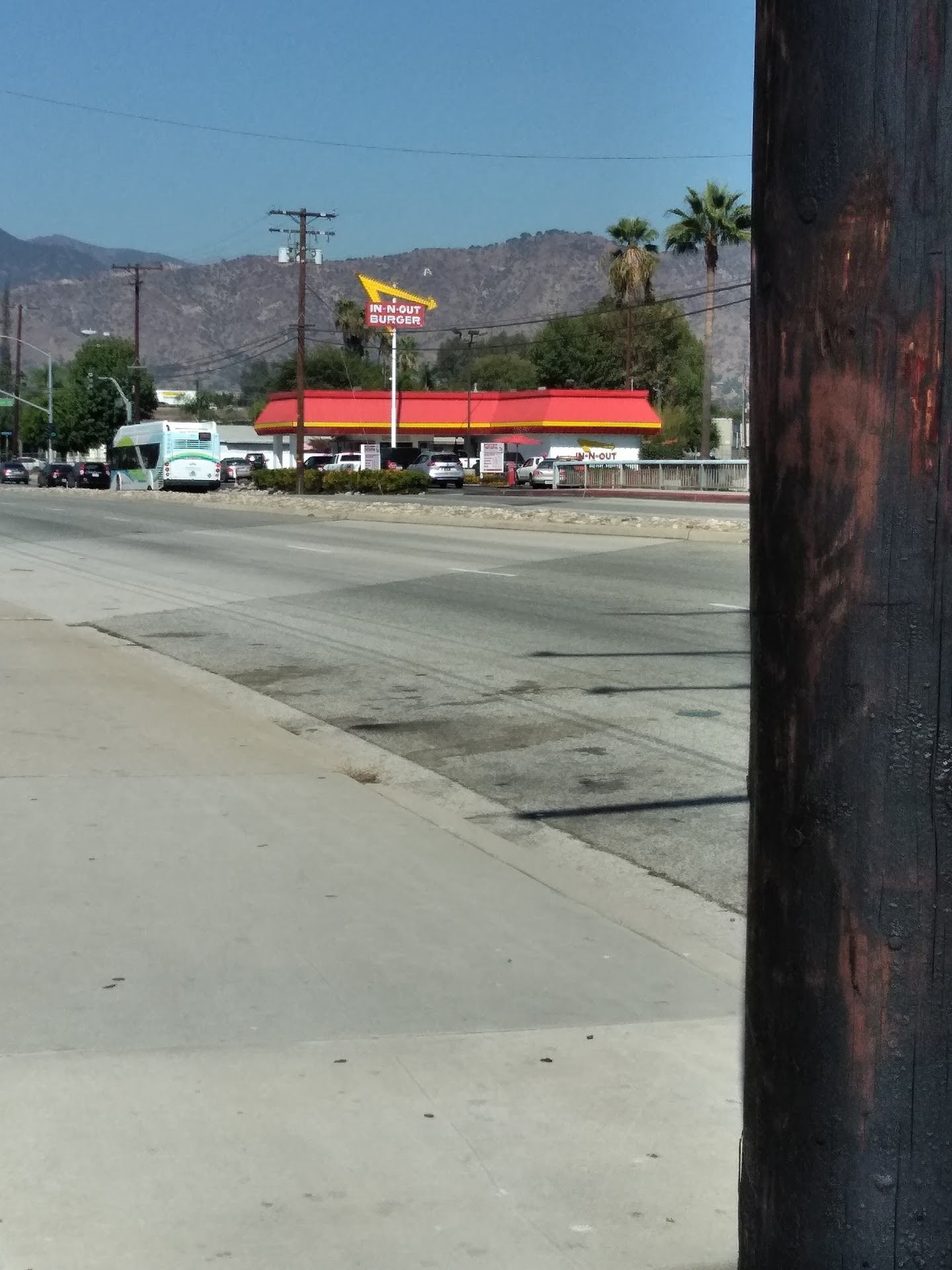 Read moreStars do not go towards food, because it was great In N Out food as usual. However they do go towards this being the strangest In N Out I've ever been to. First we pulled off the 210 and were facing a death run of a left hand turn with no turn lane, no turn arrow just wait to you thought it was clear and pull across 2 lanes. After safely making into the parking lot we realize there is no way to get to the end of the drive through line as there is no wrap around through the parking lot. You have to be going North on Azuza Ave to be able to get into drive through line. No biggie I'll walk up to the outside order window. This location has a two lane drive through one on three right side of food prep and one on the left side of food prep building, no dine in possible, and then it has an additional connected building that is used as the food storage. So workers are passing ingredients from one building to the other through the walk up order window. As for the drive through great if your in the right hand lane as you can drive up pay, get your food and be gone if your the only person in the car. Left lane well make sure you can do yoga through your car cause you'll have to lean over your passenger seat to process payment, receive food, and struggle to hear what the (very nice by the way) young man was saying. Finally our number is called and even though it's the strangest location setting I've been to, staff was still trained the In N Out way and the food was perfect. Which after all is all that really...
