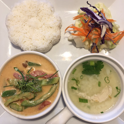 The set includes an entrée, mostly curries: red, yellow, green, or Panang. Red curry is the spiciest; green curry is mixed with coconut milk; and Panang has more flavor than yellow. You can choose a protein: beef, pork, or chicken. Pork is the best-if you eat pork. The set also includes a salad, a spring roll, and a bowl of white rice. I still miss the old lunch set-it came with both a soup and a salad. I always asked the restaurant to swap the salad for an extra soup. That soup was umami-rich, smelled like chicken, and had a few grains of rice at the bottom of the bowl. I miss it.