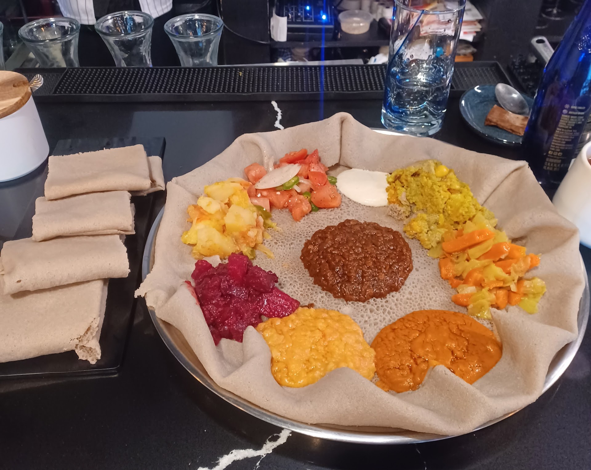 However, our excitement quickly turned into frustration when it came time to order. We were given a choice between Ethiopian injera and house injera. Concerned about the potential use of preservatives in the imported Ethiopian injera, we opted for the house injera and inquired about its ingredients. Surprisingly, neither of the two servers we spoke with could provide us with a clear answer.