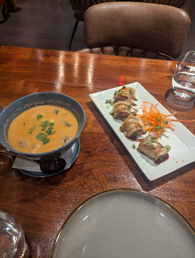I had the lychee iced tea $5.85, 10/10, it had a delicious flavor, and the lychee and Thai tea was a perfect pairing and a refreshing treat. The spring rolls (3) with vegetables $6.95 were crispy, and the vegetables inside were very flavorful 10/10. I also had the chive dumplings that were fried 7.95. The dumplings had a really good texture and were tasty but now realize, I'm not a big fan of chives. It was a bit too many chives inside the dumplings for my personal preference. However, they still had a good taste 8/10. The Tom Yum soup with tofu was 6.95 and my least favorite item of the evening. I could not eat it. It had a very tomatoey taste and not the typical Tom Yum flavor I'm use to. I would not recommend this dish 0/10. For my entree I enjoyed the hang over noodles with vegetables $14.95. The dish was an extremely large portion, enough for 2-3 people. The noodles were very flavorful, I enjoyed the gravy, and the vegetables were very fresh.