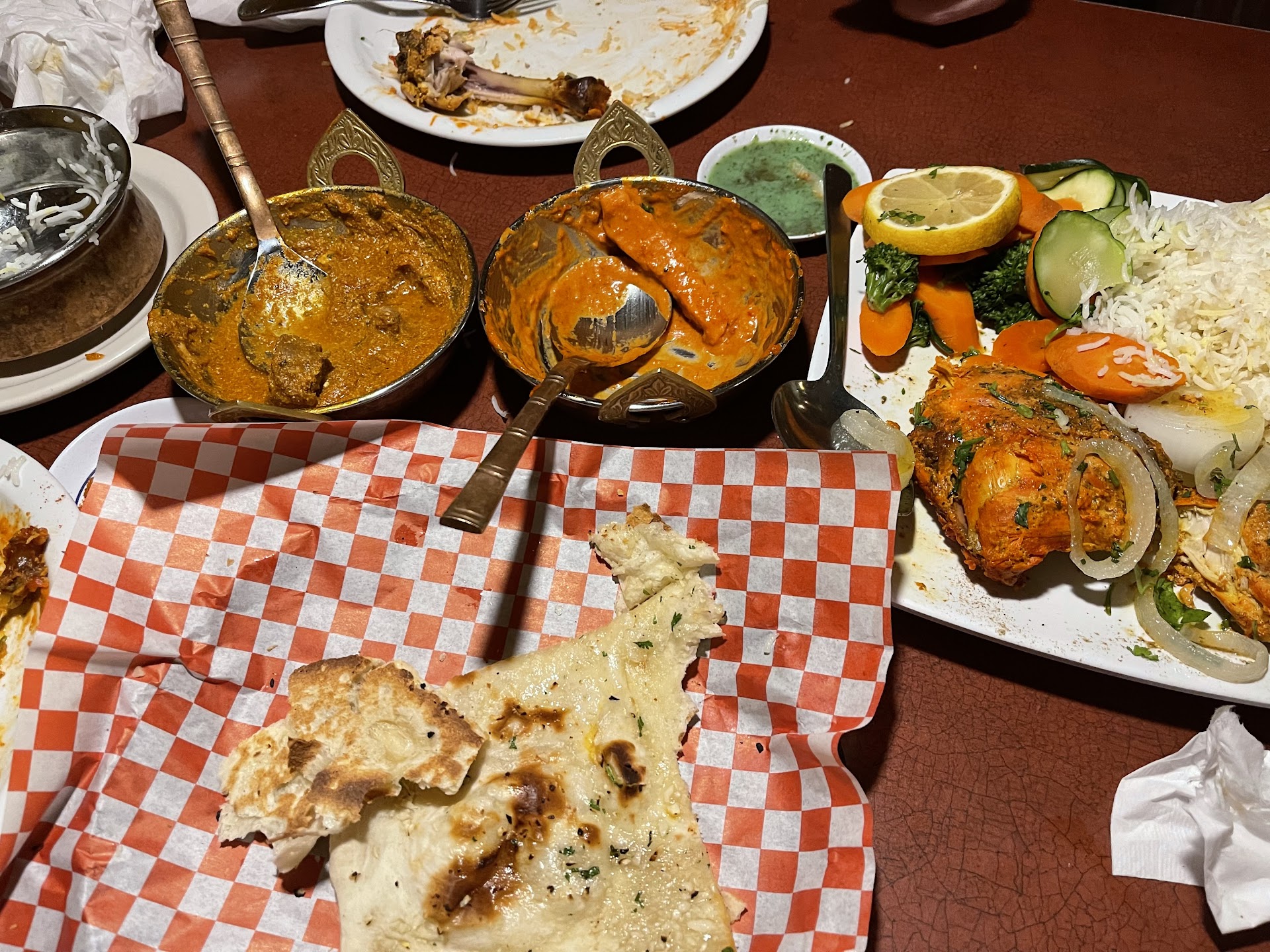 After an experience like this I start analyzing reviews. It appears they have taken their high rating for granted, much of which is likely faked, as I've never seen so many reviews where the author has only written just one review or two at most (hmm, what are the odds?). Anyway, when there are 6 tables occupied with mostly couples and there's 2 servers, one should be able to receive decent service with a server handling 3 tables each (I use to be a server, so that's an easy night). NOT HERE. There were two at our table and we ordered three dishes and naan. Firstly, no one will come to take your order unless you push the button on the little electronic device over by the window at your table. If not noticing this you will be sitting there a very long time. No water, nothing until they take your order. Our folded up menu's sat there on the edge of the table and servers would just walk by and ignore us. We were almost ready to leave when I noticed the device. Surprised the host DID NOT MENTION THIS when seating us.