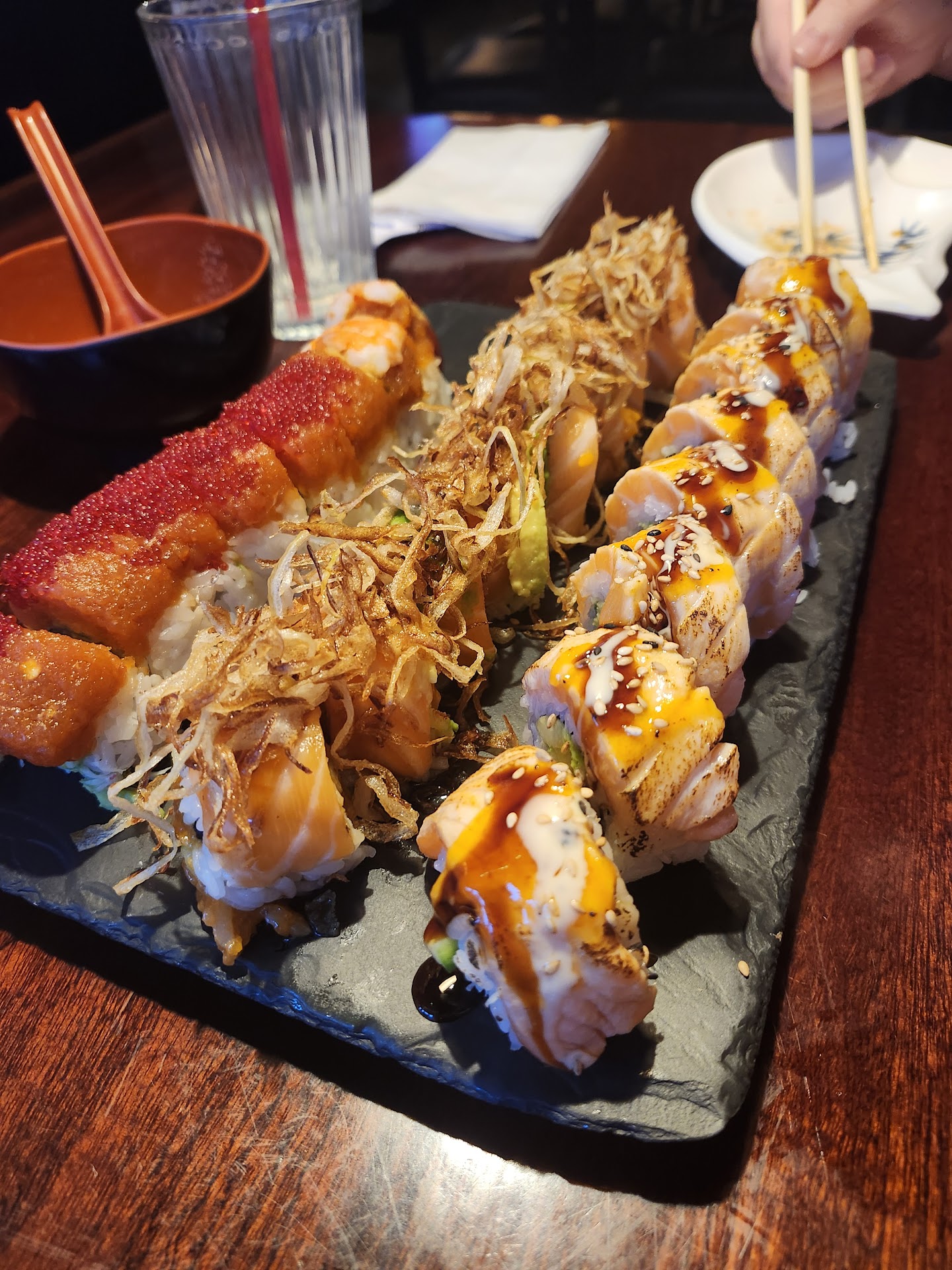 My boyfriend and I went here as a celebration for his job promotion and let me tell you, I will definitely return. The moment you walk in the atmosphere shifts, it's a wonderful ambiance, the service is very pleasant. We had a reservation and was taken back early. To start we had lemonade and iced green tea. The lemonade tasted hand squeezed and so fresh. The iced green tea was so refreshing and even though it's unsweetened, you could finish the whole glass without a care! For apps we selected a few to try, the gyoza, tempura avocado, cucumber salad, and some miso soup. 3 of those were a 10/10. The gyoza did not even need a sauce it was wonderful, the cucumber salad was marinated in a beautiful sauce, the miso soup was so flavorful. The only item I rated lower was the avocado tempura, purely for the fact it comes paired with a creamy sauce, personally I used the gyoza ponzu sauce for it and it was much better! For sushi items we got the Salmon Lover, Seared Salmon, and Red Dragon. All rolls were delicious, seared salmon was our favorite and red dragon was our least. But we would still consume them all again. The rolls are pricey at $26 per roll, however, you get a HUGE piece of fish laid atop the rice and real crab in every piece. Just on the size alone it's worth it. For dessert we had sesame balls, fresh and so so tasty! My boyfriend also got the pork katsu donburi togo for his lunch and that was amazing even...