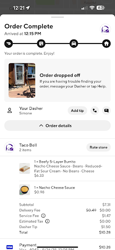 Now, onto the food… ever seen those commercials where a family of six is feasting like royalty with mountains of tacos, burritos, and melty goodness for $20? Lies. All lies. I’ve ordered $30 worth of food here and still had to microwave a Hot Pocket afterward. I swear, some of those tacos are made with tortilla shavings and a dream.