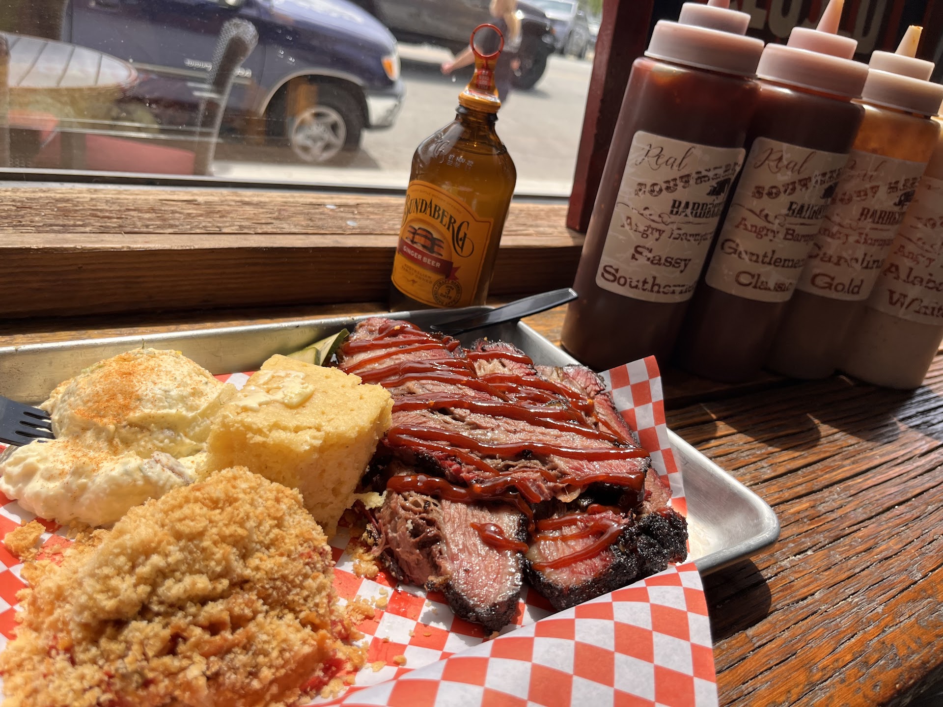 Moving on, we sat outside and I guess they forgot about us because after receiving our order of the Corn Salad and Texas Caviar, which was suppose to be with our sandwich, but whatever, we waited for an additional 15 minutes until we had to walk inside and ask where our sandwich was. At no point during the time we were outside did anyone check on us or ask us how we were doing. Which I understand, they are a take-away restaurant but if someone had done this, we would have been happy to let them know that we were missing a sandwich. When we finally received our sandwich, which I guess was waiting for us inside because the person was able to give it to us right when we asked for it like a magical sandwich fairy, it was lukewarm and had no sauce. Which is crazy, because the place has 4 amazing sounding sauces on display. I'm not sure if we were suppose to ask for them, but is that really something the customer needs to ask for at a BBQ restaurant. I mean come on, it's a barbecue restaurant, you expect amazing sauces and I was really let down to be give a dry sandwich. Also, our request to have the sausage on the side as it was a 3-pepper wasn't done, but that is very small something that I can easily forgive.
