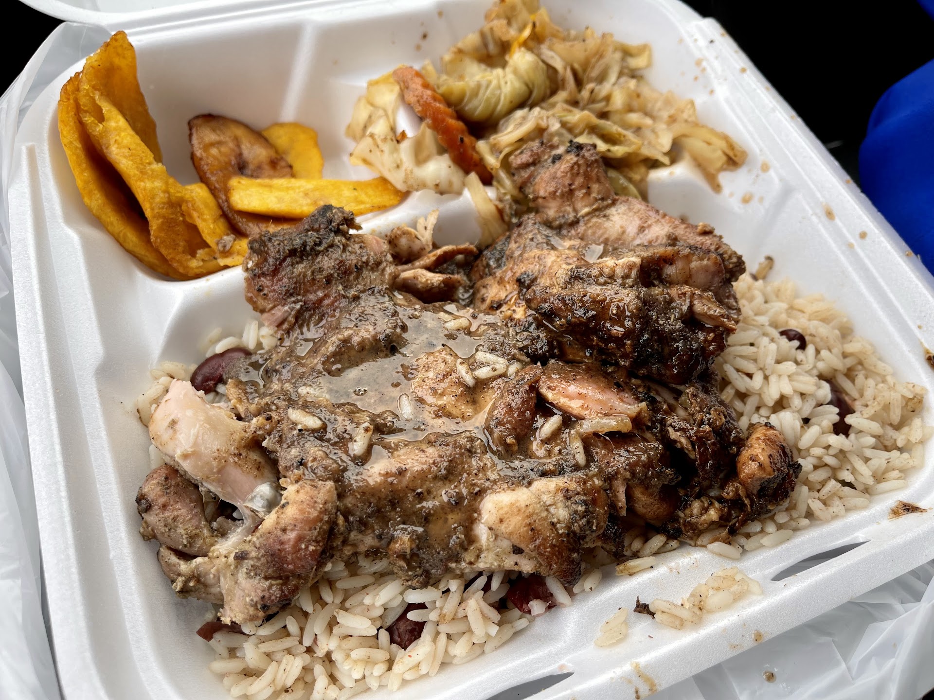We decided to try the most popular dishes: curry chicken and jerk chicken. Since it was dark, we couldn’t sit at the outdoor tables, so we took our food to the nearby Costco parking lot and ate in the car.