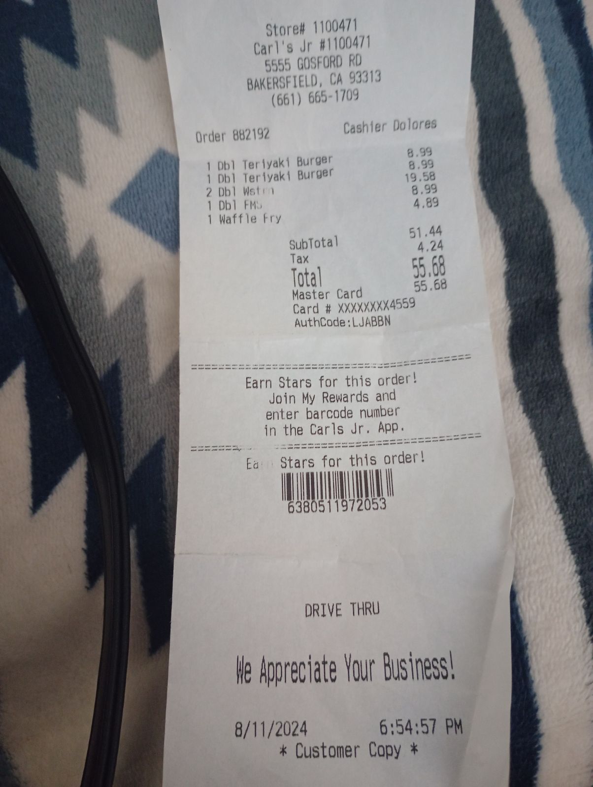 Read moreNot good. Only 2 poor employees working with the line for the drive thru 15 cars deep. The line was so long that I decided to go inside to order. When I ordered my food I didn't realize till it was to late that there were only 2 employees working. I patiently waited for the food not complaining to the employees,in sure it wasn't there fault. It took about 25 minutes to get a simple combo order and 2 shakes. Carl's Jr you as a large company really must treat the employees better by staffing the appropriate number of staff to run a very busy location. There should have been 4-6 employees to help. The employees were yelling at each other and customers were very upset. When I finally got my food the same cars were still waiting in...