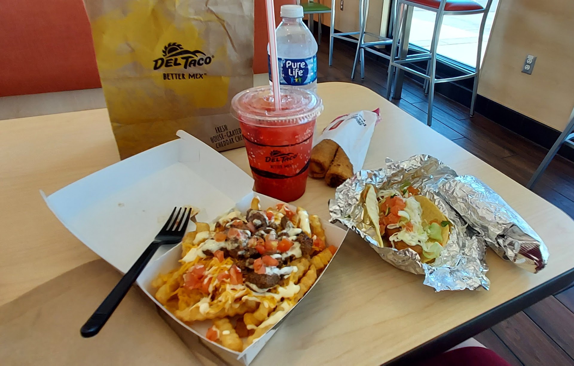 Read moreI absolutely love this Del Taco! I go there for a quick bite or drink while I wait for the regional transfer bus. It's close and I especially like their new Strawberry Boba Sprite! It has real chunks of strawberries AND delicious flavored boba beads! SO amazingly good, it's difficult to just have one drink. I've been there several times and the staff has always been helpful and friendly. I made a mistake and didn't check my order thoroughly and accidentally missed taking guacamole out of the asada steak fries but the manager was really nice and had another one made for me. I really appreciate the great customer service they have there as well as tasty food and drinks. The only complaint I have is I felt a little uncomfortable with some of the people in there at the time I was there, but they weren't causing any trouble so I let them be and they let me be. I met some very nice customers over the last several months, had some interesting conversations and the restaurant itself is very open...