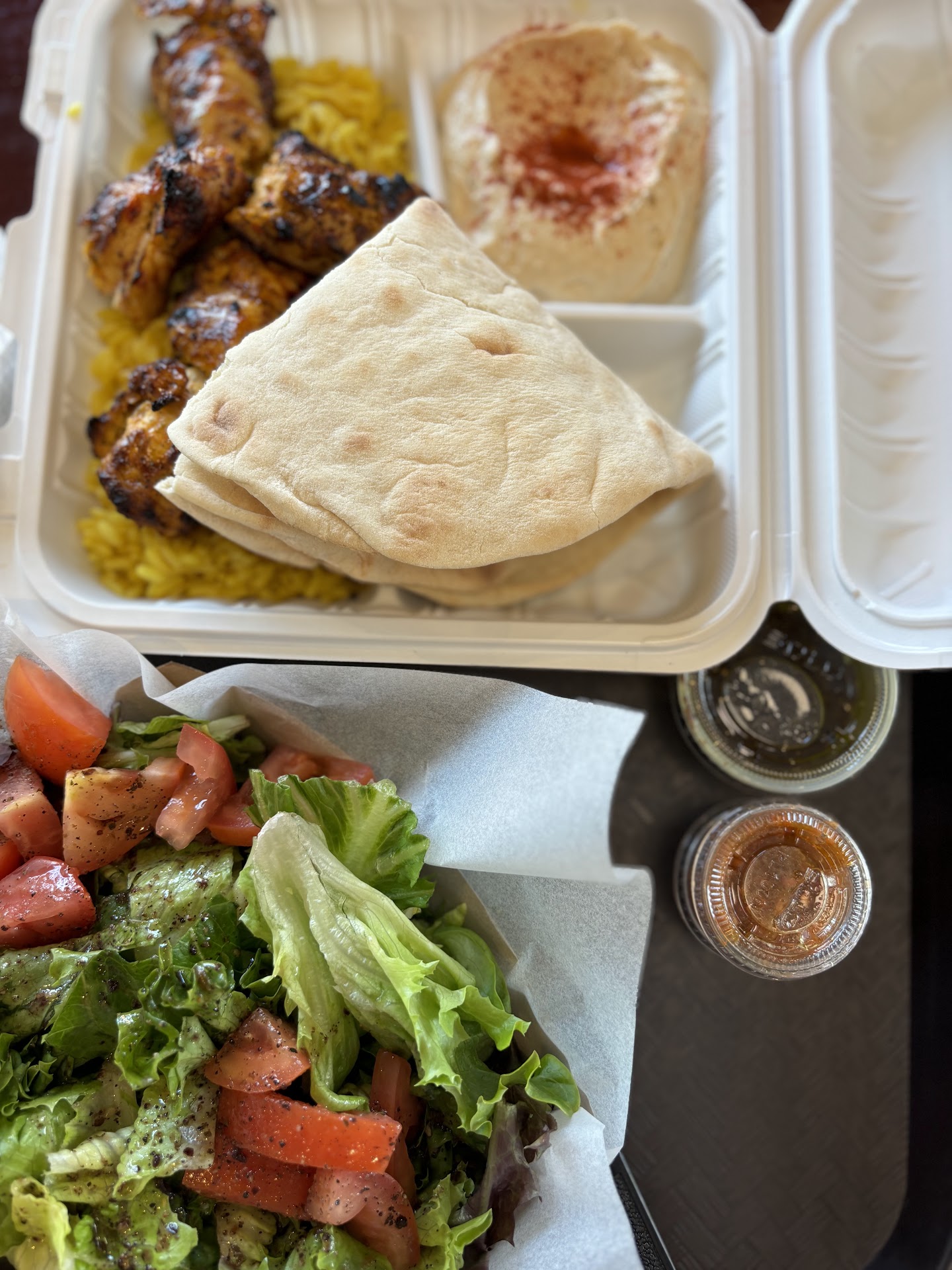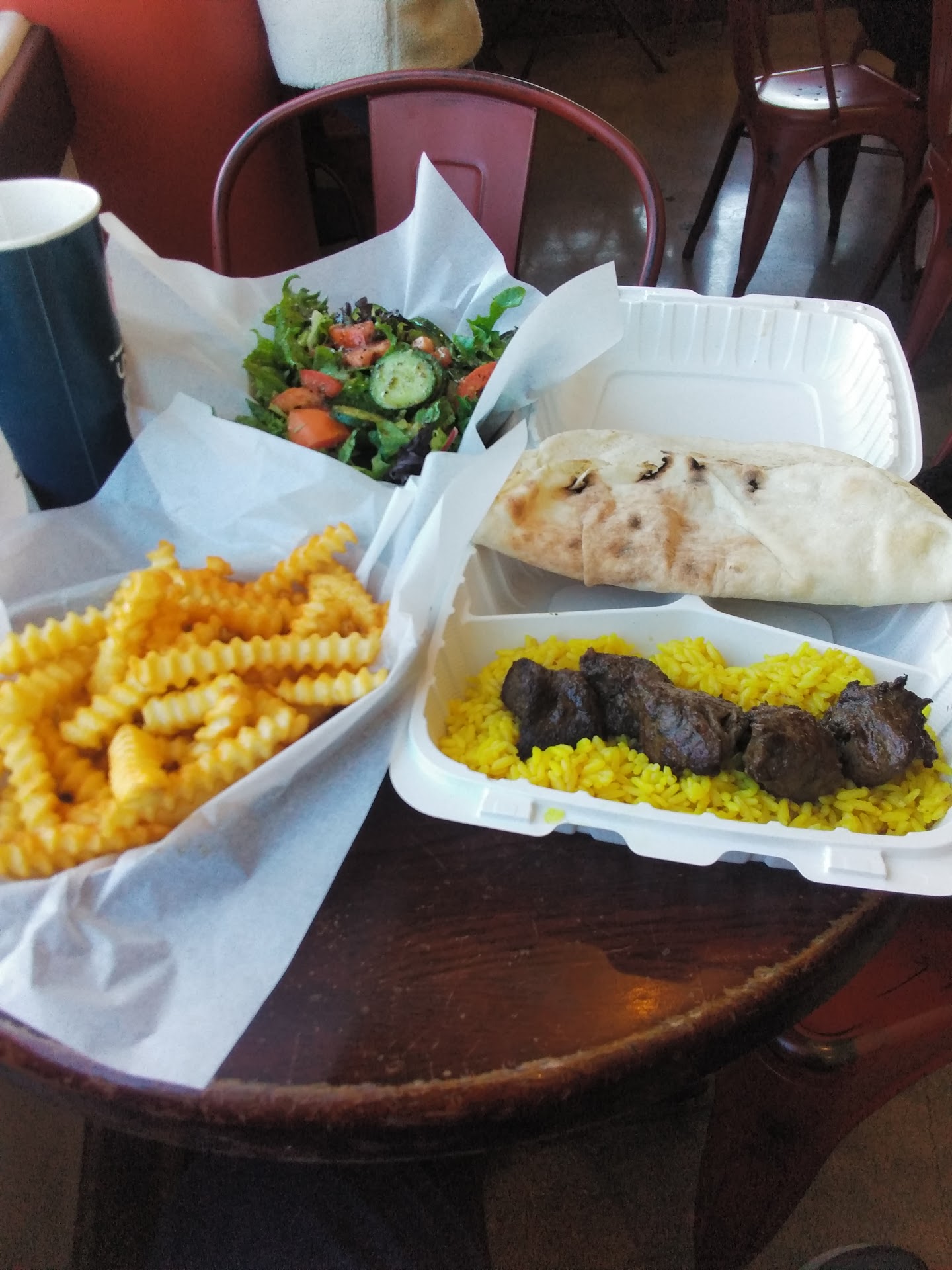Beef kabobs on a bed of rice with fries and a salad. But you cannot forget the pita.