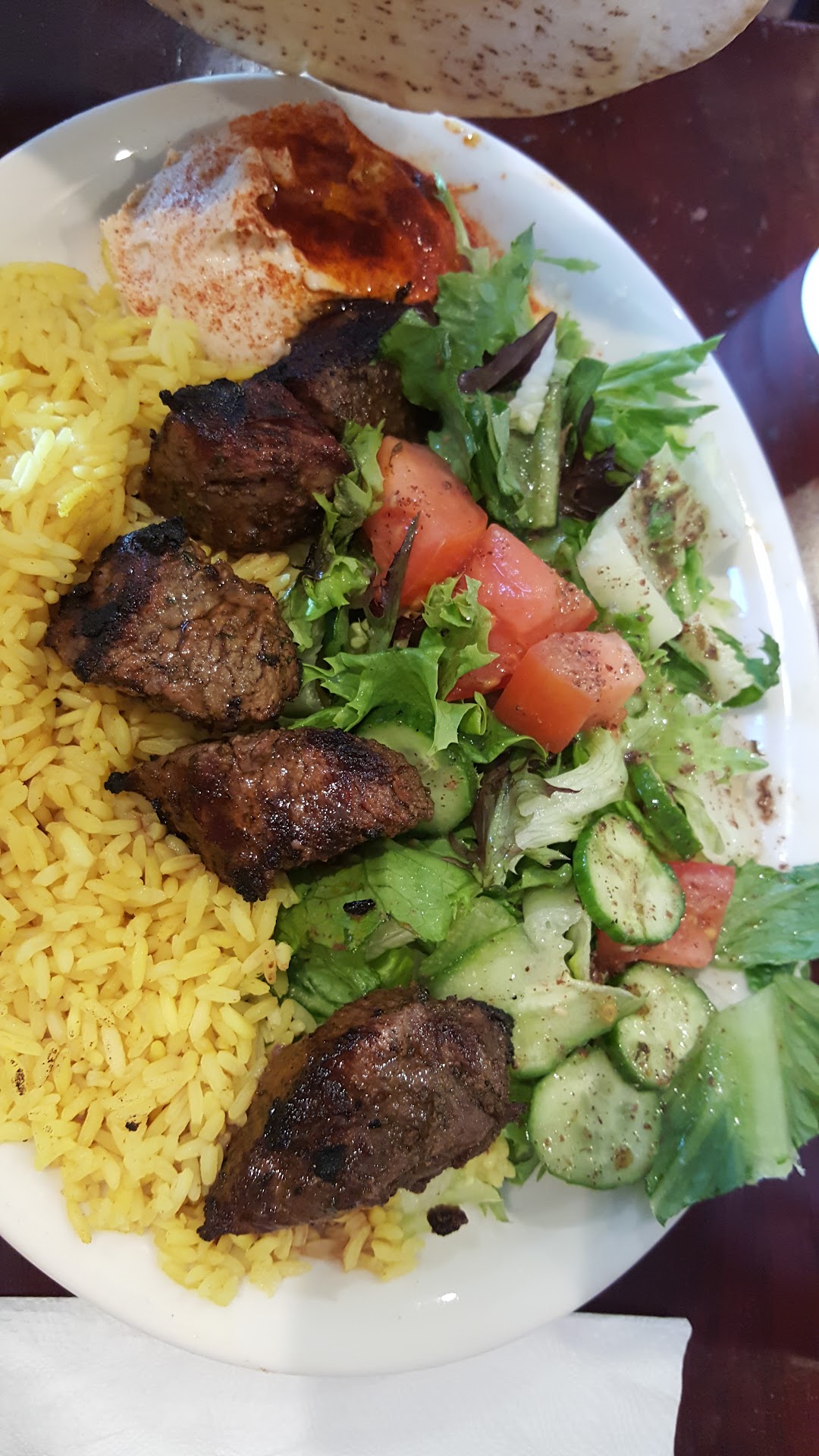 Beef kabobs on a bed of rice with fries and a salad. But you cannot forget the pita.