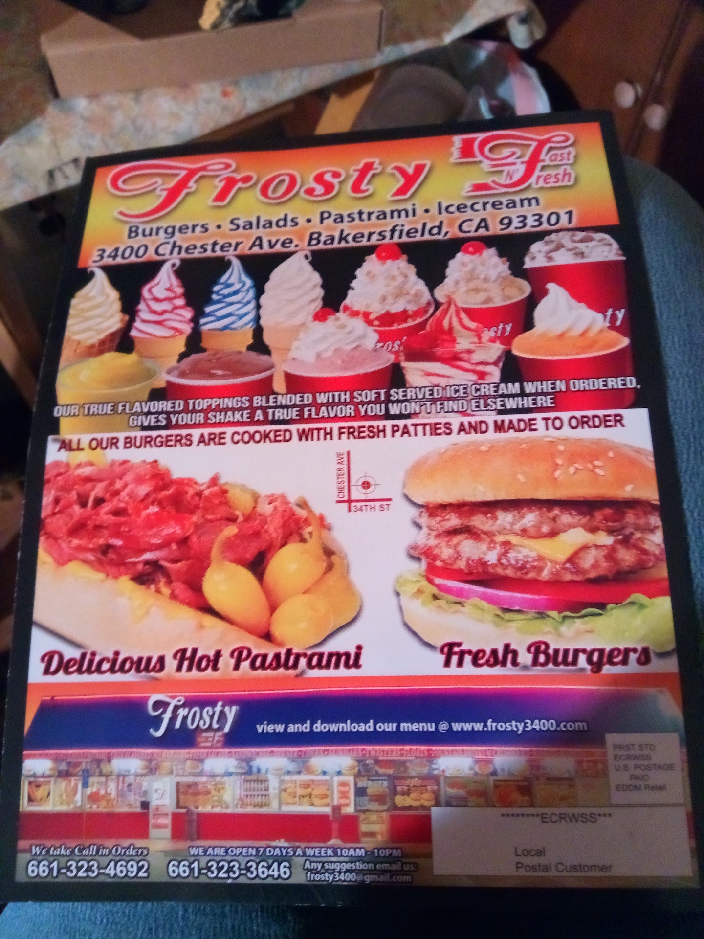 I love the food very good I'm not a healthy eater. But if you are and some of your friends like a big giant burger, you'll all be happy at the frosty fast and fresh they have it all Haven have protein drinks I think you'd be very happy if you're a good eater they have night it's clean it's nice the restroom there's only one so it's I guess the unisex but other than that it's great it has a great parking lot and it has a drive-thru your food is made when you order it and is not made ahead of time they do call or you could call in and pick up they don't deliver I'm right on the corner of 34th and Chester can't misplace their menu is wrapped around the whole building. Saying high we got the good food come on in and as I said before crushed ice for the sodas. And the kids are just as loving their ice swirled ice cream in all sorts of colors they've got blue red pink green I haven't had one myself but the kids that are in there or just loving it. There add 3400 34th Street & Chester av there's no way to miss it. They they have great dills you can get you can get three hamburgers three fries 3 sodas combos for $16.99. and a shrimp basket for $5.99 I've had that it's pretty good. these are all day deals Not Just dinner. They do have a special deal do the week of Monday Tuesday Wednesday specials Monday the frosty double fries and a drink 575 have a avokado burger on Tuesdays for 675 very good and so on it has other stuff the rest of the week and they have what they call the happy hour 5 to 9 they have any drink$0.93 one corn dog $0.89 chili fries are $5 they're pretty big though I've had that 2 regular burgers for $4 so that's pretty good and like I said they do have some healthy foods chicken burgers and whole wheat bun I have salads and chicken salads and fish salad I've had the fish it's pretty good. They have lots of appetizers you can get okra cheese sticks keeney's the mushrooms they have fried pickles fried beans mac and cheese bites and so on one minute they're many was outrageous this is how is so much stuff but the price must make a trip by try it out I think you're really going to like it I give this place five stars I eat there all the time. I hate to say it but I don't cook but they do...