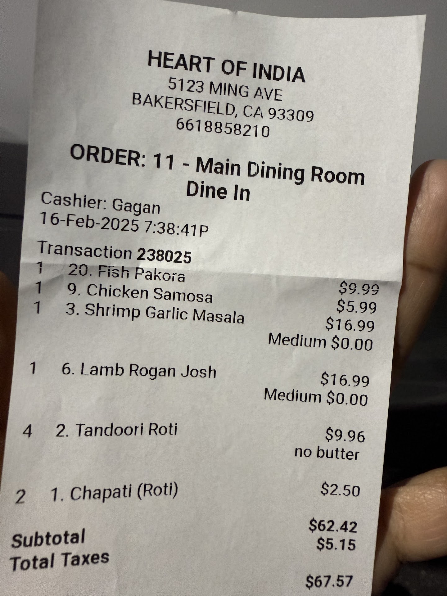 I recently dined at Heart of India bar and restaurant in Bakersfield and had a frustrating experience due to the staff's rushed demeanor. Even though we arrived well before closing time, we felt like we were being hurried through our meal.