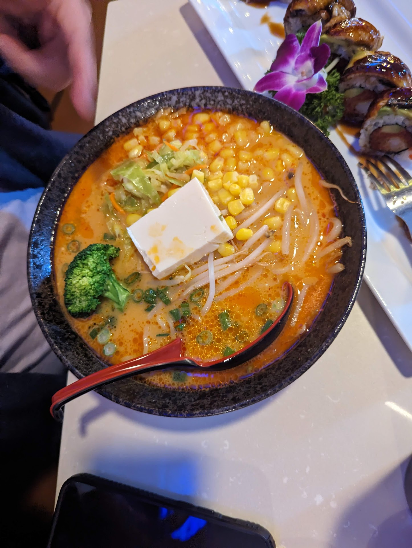 Read moreGood atmosphere that serves sushi and ramen of various types. We ordered the Hon Ramen, spicy Garlic Ramen, vegetarian ramen, spicy tuna roll and hidden dragon roll. All the ramen and rolls were very tasty and the presentation of the food was nice. The place has street parking in front and has a sushi bar located in the rear of the serving area with tables for seating in the front. There are also TV's on the wall on both sides showing various sporting events. We had NFL on one side and march madness on the other. The broth of the ramen was very flavorful and the soft boiled egg was very tasty. Prices are reasonable, 12-16 bucks for the ramen and 8-16 bucks for the rolls. You can expect a bit of a wait time to be seated as it is not that large of a place. We had a medium sized group which took a little longer for a table to be prepared. Not necessarily kid friendly as they don't have a kids menu available, we just got our son a bowl of rice and shared some ramen with him. Overall, I...
