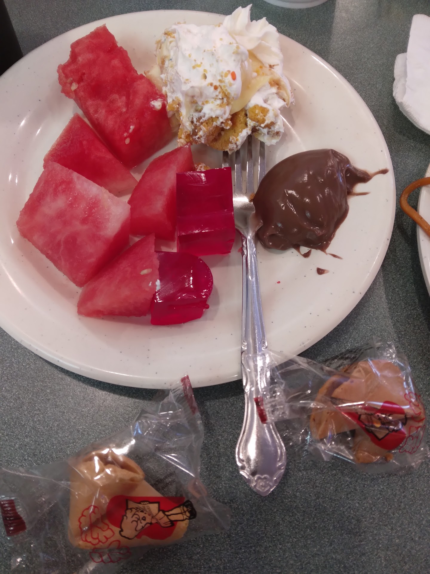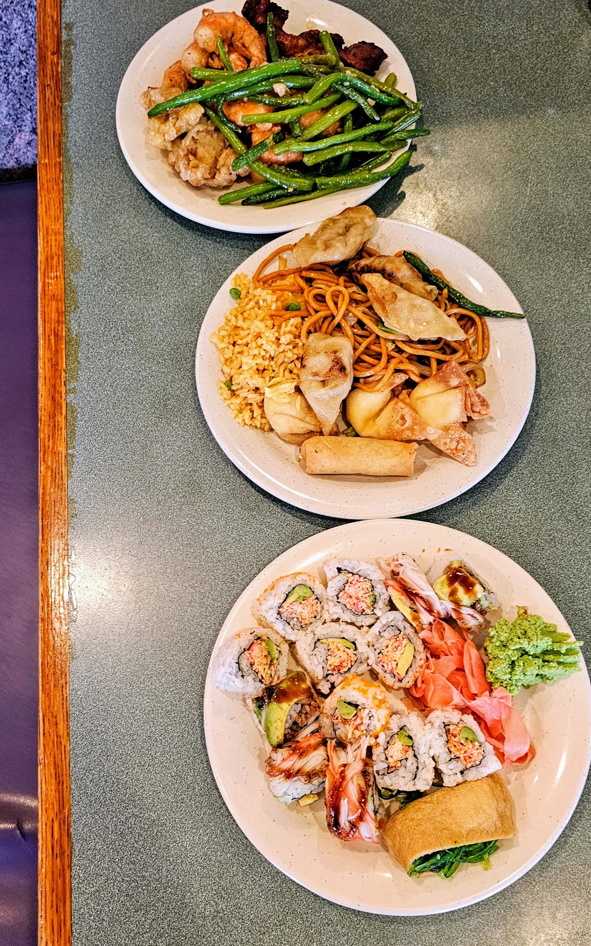 So we tried a little bit of almost everything, The wierdest thing happened, We couldn't eat more than one plate, Mostly those buffet places they put a lot of spices and salt so you can get full fast, We didn't eat mich honestly, And i honestly "A big guy" was stuffed like never before from an asian buffet???? Come on now, Honestly the food taste good, But when i finished the first plate 5 items "Half a spoon of 5 items is nothing", I was so stuffed that when i grabbed the 2nd plate i put 3 items half spoon, I couldn't finish. I said well overloaded with spices and salt "But honestly not to that point",