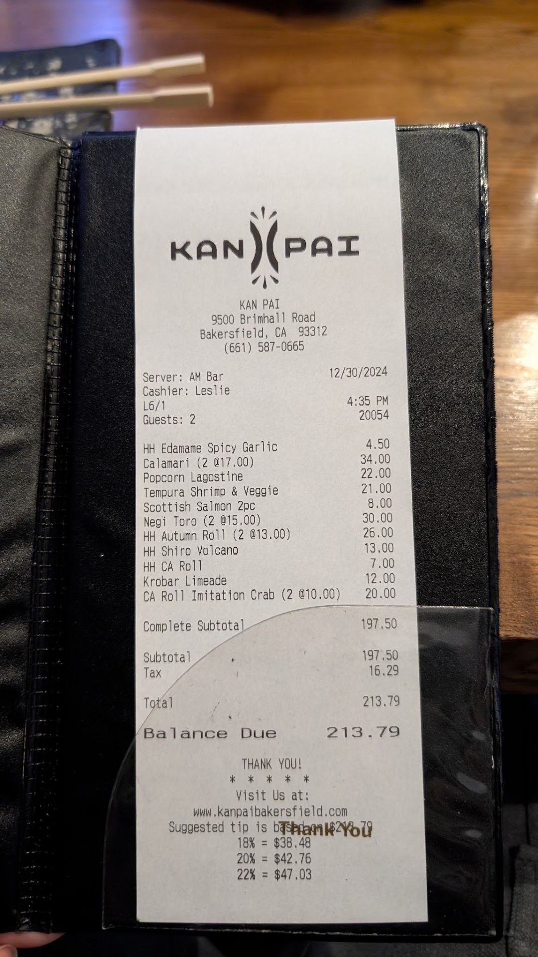 Food was ok but the service was TERRIBLE!!!!! We visited Kan Pai tonight for the first time. After ordering 3 rolls, a Diner plate, several appetizers and desert, we waited over 20mins and never saw our waitress again... when someone else came to fill up our water, I asked where our rolls were?? As the table next to us, was seated well after us, ordered well after us and had already received their 3 rolls and were mid way through their meal.... The bus boy said he would check. Again no one came by... 5 mins later he brought us 1 roll. 10 mins after that our next 2 rolls came out... After our food was delivered, we were checked on 1 time in 45 mins. Our drinks, hot tea, iced tea & wine, were never refilled or even asked if we wanted a refill. . Dessert was ordered when our initial order was placed. And never brought to our table. We sat and wait about 10 mins after finishing our meal and the check was never brought to us. We ended up having to go up to the front desk area and ask for our check. We got our check, paid and walked out. Over $100 for a Horrible Experience!!!! After I began feeling like, Why should I pay for the dessert I never received? and why did the waitresses, when I paid, not offer, to remove the desert I never received? You’re OK with me paying for food I never received? So I went back in and asked to speak with the manager, Randy the owner ended up coming to speak with me. He refunded me 4 dollars. Yep an entire four dollars!!! He credit me from the desert that I never received. Wow! Thank you so much. After telling him what a horrible experience it was. After telling him she did not check on me, Except one time in 45 minutes. He offered me an entire four dollar refund. The table next to me was checked on 10 times. By the same waitress. And I was checked on once. His response was sorry it’s so hard to find good help right now. No one wants to work and we’re constantly understaffed. He said he is literally chasing his own tail right now trying to find staff. Needless to say, this was a Horrible Experience. We will not be going back. And the way that Owner handled it was even worse! Now I understand why the staff is,...
