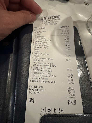 Read moreI wish I could give this place 0 stars. My husband and I went for our anniversary, as we have never tried the place and felt like having good authentic Italian food. Well, this was not the place for that! The entrees were OK, nothing spectacular. The bread they give you is not very good at all. We each took a bite and that was it. I'm sorry but you better have some good bread if you are an Italian restaurant! What really got me, however, was the fact that they charged me $16 for a side caesar salad! The menu said you can add a soup or salad for $4.95. When the waitress asked if I'd like to add either I said "yes, i would like to try the caesar". It was literally romaine lettuce with 2 croutons and like 2 small pieces of parmesan cheese. The dressing wasn't very good so neither my husband nor myself even finished it between the 2 of us. When the check came and I saw the price I questioned our waiter. He very rudely explained to me that it's a "house" salad that you can add for the $4.95 price, then proceeds to basically rip the check out of my hand and goes and runs our credit card for the full price. I could not believe the lack of customer service he displayed in that moment. I also can't believe they have the gull to charge people $16 for some lettuce! I will never step foot in this place again and will make sure my family and friends...