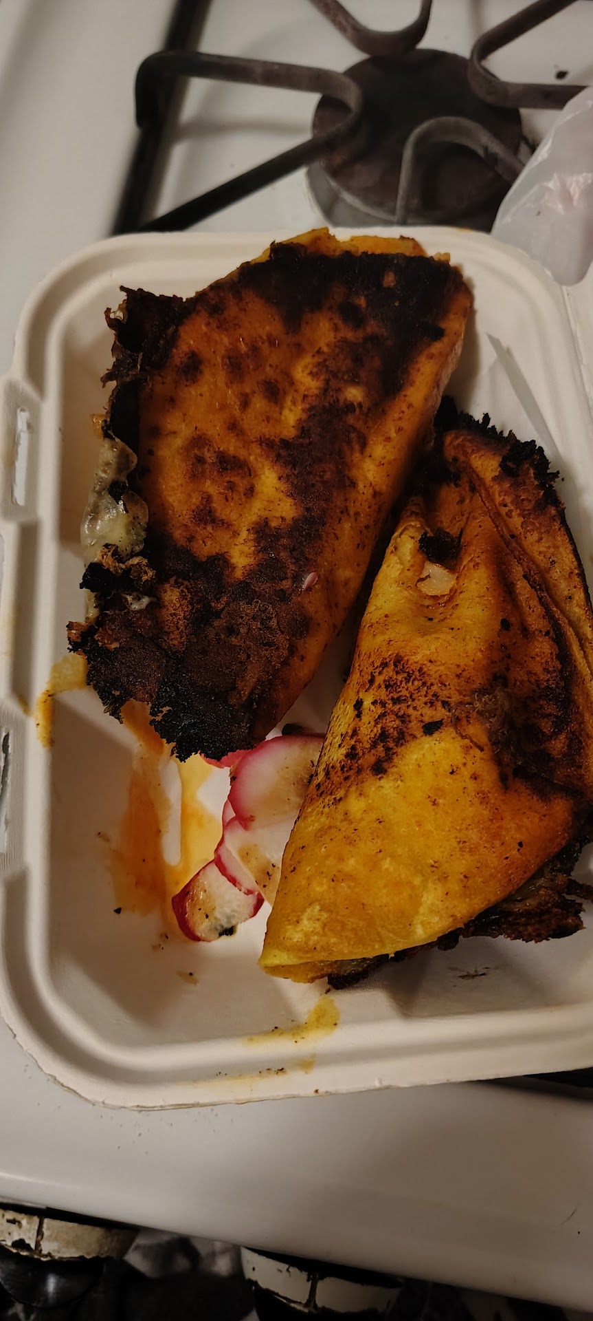 Went to this place today and first of all the wait line was 15-20 mins and then my 2 wet burritos carne asada was a lil burn but I just took out the burn meat which was already annoying since we were very hungry and I bought my husband some quesabirria tacos to take for lunch since he works graveyard shift and I'm ready to take them out the box to put in a plastic container for him and let me tell you these quesabirrias tacos were super burnt and how could the cook and cashier think this is ok for them to still give to customer. This is the last time I go to this place and also the cashier had a attitude like she just was trying to rush you when asking for salsa. So low on this restaurant to think this is ok to serve, if they don't care about their customers then why work there. Judge for yourself, here it is, that way other people can see the charcoal quesabirrias tacos...