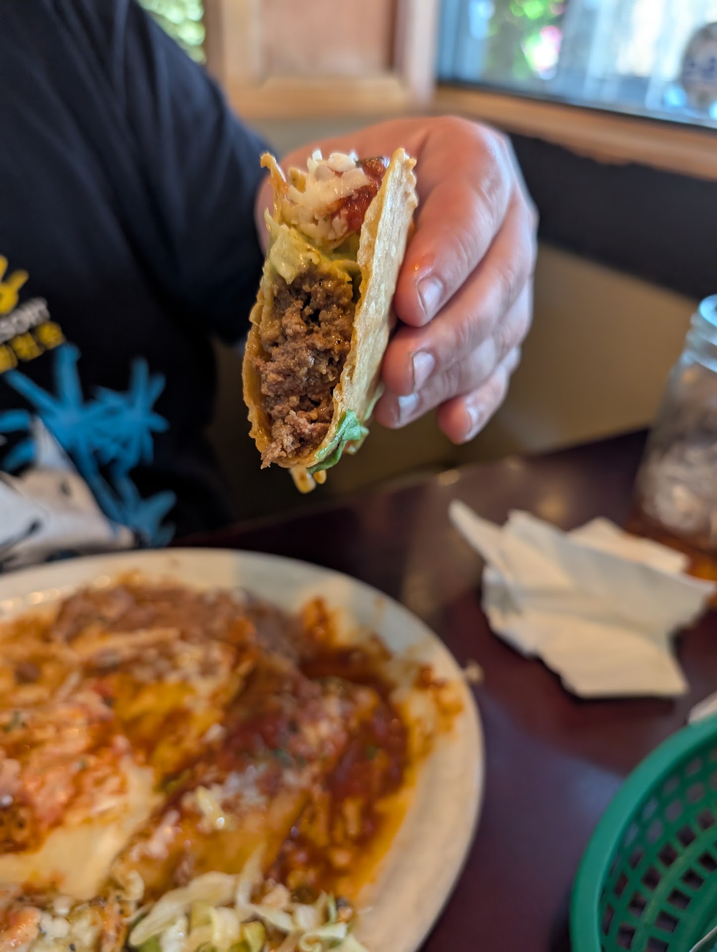 The plate was artfully arranged with Spanish rice glowing a warm amber color, alongside velvety refried beans topped with melted cheese. Fresh guacamole, sour cream, and pico de gallo added bright pops of color and texture. The accompanying corn tortillas came wrapped in foil, keeping them warm and pliable. They are very generous with the crunchy taco filling as well. 😋😋😋