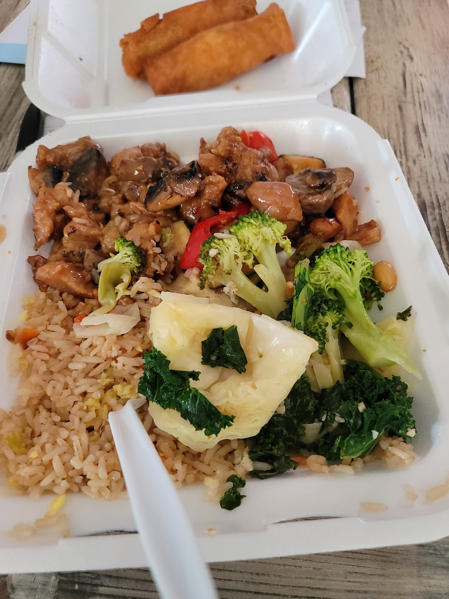 The food was good and it was hot. The line was long. The counter service was terrible. One older lady (the manager) working the food line and one young lady working the cash registrar. The older lady was intrested in trying to up sell your order. (you order a Bowl, for a dollar more make it a plate) She ask a questions and did not wait for an answer. The older lady did speak loudly or look at you directly. She skipped over people in line and had to double back. The younger lady at the register could have been faster at the register, but she had to finish orders that were incomplete (side orders & extra items). Plus the younger lady had to sort orders that were out of order because of the older lady. The seating area was only about a quarter ways full. The of the tables weren't wiped down and self service drink area was a mess. I've been inside this particular store before during lunch and dinner rush. Gotten better and faster service. I've seen the place look a lot cleaner and kept in better shape during those busy times. Hopefully it's better the next time I visit. Hopefully this is not a new onwer or manager style of trying save money and increase the stores...