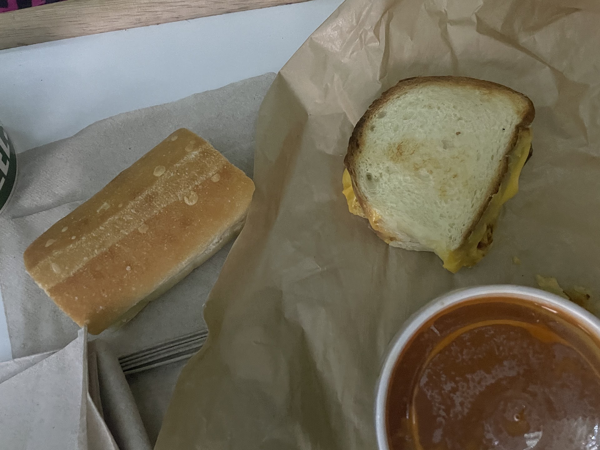 Steak and white cheddar sandwich: the sandwich comes on ciabatta bread and I had asked for regular white bread and regular mayonnaise. There was a small ball of thinly sliced meat in one spot of the sandwich and the white cheddar was melted into 1 half of the sandwich. It also still came on the ciabatta bread and there was Just nothing to my sandwich.