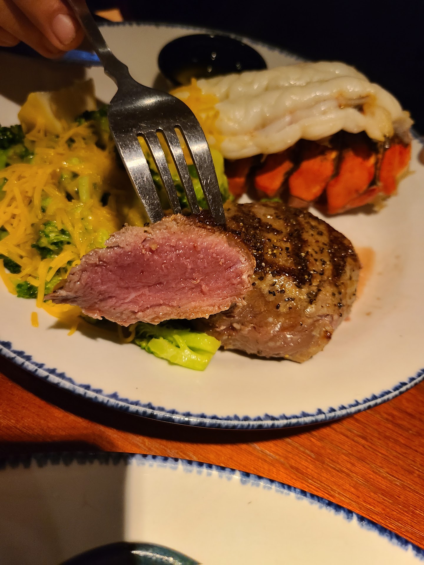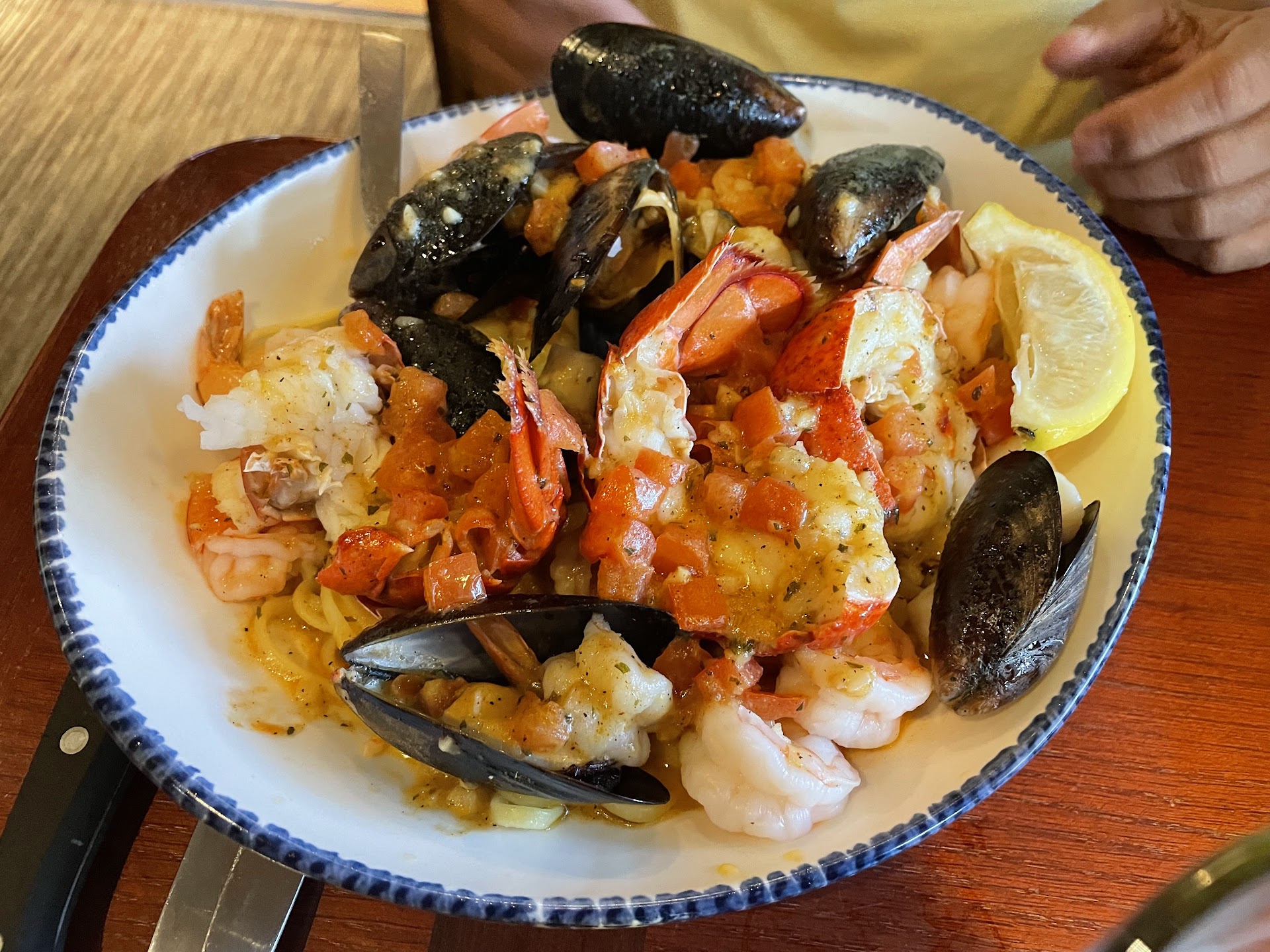 Read moreFirst and foremost, shout out to Benjamin the waiter. He was very nice, seemed a bit nervous, but overall a great waiter. When I told him it was my mom's birthday he went out of his way to help celebrate with us and sang Happy birthday (two guys including Ben and yes they both wore masks, I didn't know they still did that singing thing). There was a wait for them to clean up a table, which was no issue. My kiddos eyeballed the lobster tank. We ordered our food and began our conversation/ waiting. This was my second time eating here, the first time as a young teen. The wait wasn't horrible as we snacked on that tasty bread, not too much garlic, and oh soft. When our food arrived my eyes were full just by looking at all the plates. My kids got children portion items and they were content with the size but disappointed by the taste. My oldest got fires and chicken, both had minimum seasoning. Chicken was dry, she was disappointed. I shared most of my meal with her as she dipped her fires into their ketchup grave. My youngest had the fried fish with orange wedges. She loved the fish insides but thought the breading was salty, which I agree. Orange wedges were yummy though. I had lobster, salmon, shrimp with a baked potato and steamed broccoli. Now mind you ive never eaten actually lobster. It was at times more chewy than I expected and slippery at others. The salmon was amazing, well seasoned and cooked to perfection or dam near whatever prefect taste like. The shrimp was also well seasoned but a bit harder to chew than I thought, maybe the shrimp worked out too much. The broccoli was good and the baked potato was delicious, not salted at all which is good for my health. I had peach tea and after drinking unsweetened green tea all day it was refreshing. My mom had basically the same thing I did but with rice and mashed potatoes, it was called something else but I can't recall the fancy name. She also had giant Pina colada looking smoothie, thing was comical size. Bit too sugary according to her but still tasty. Overall it was a enjoyable experience and I do...