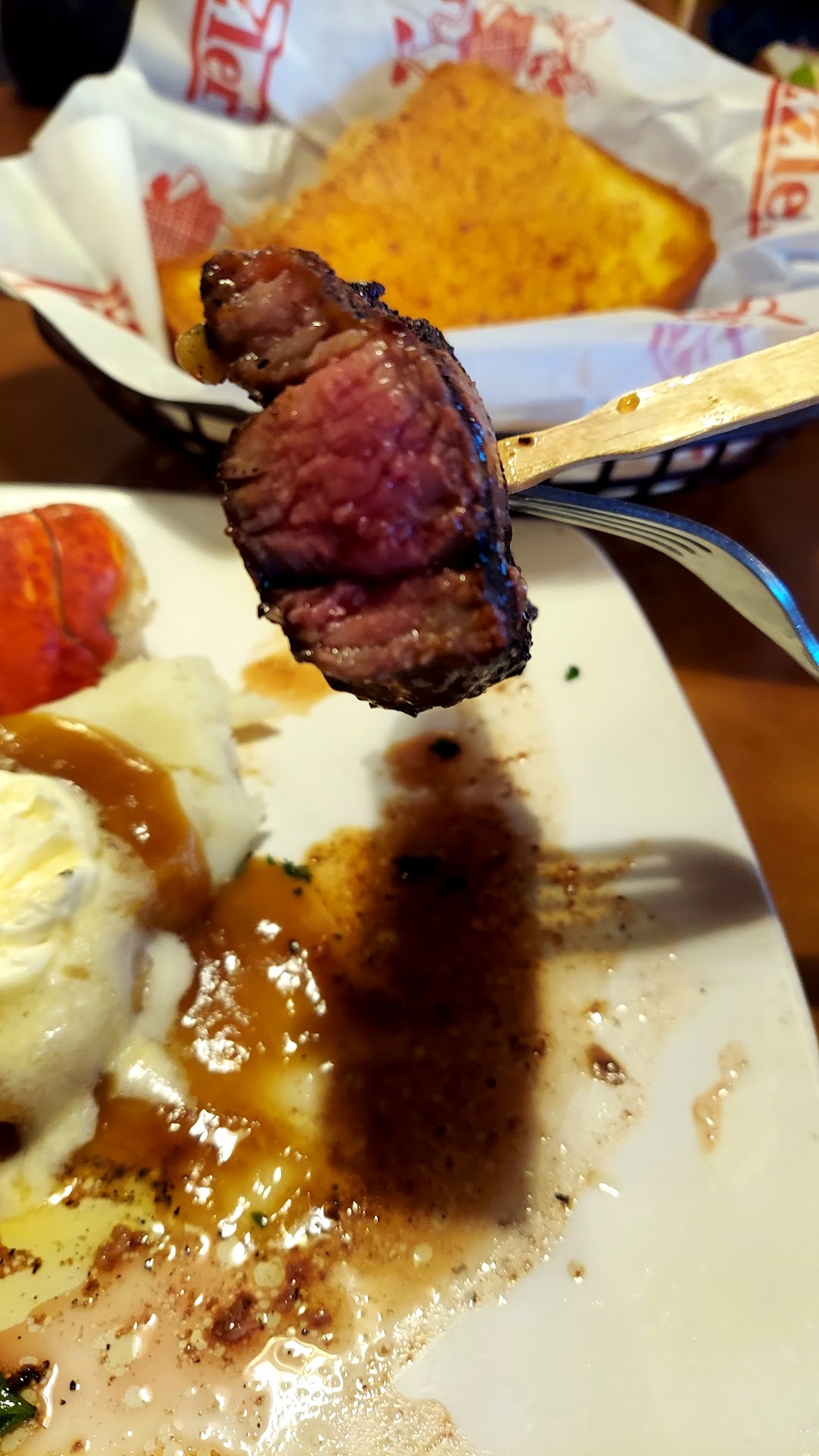 My food came out pretty fast Which is a good thing. my steak had a very nice dry age flavor however the dry age flavor was getting overpowered by The sear on the steak it tasted pretty burnt and was a bit unpleasant to eat. my lobster tail was good flavor wise however it was a bit overcooked and it was very rubbery. i ordered my steak medium you be the judge for yourself based on the pictures i provided on how they did. the mashed potatos were alright nice and fluffy but nothing special.