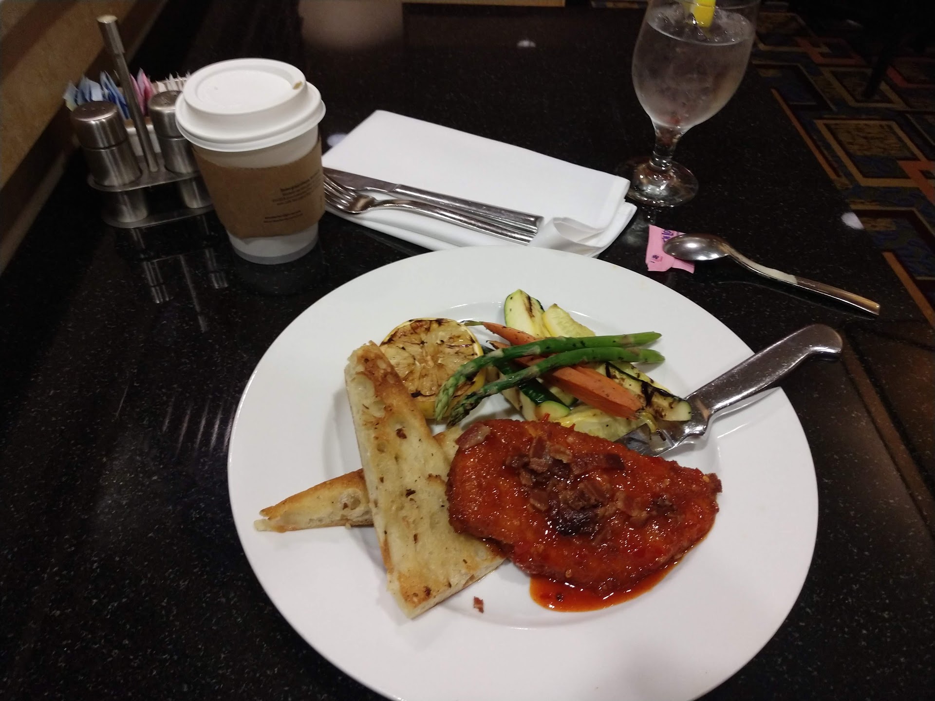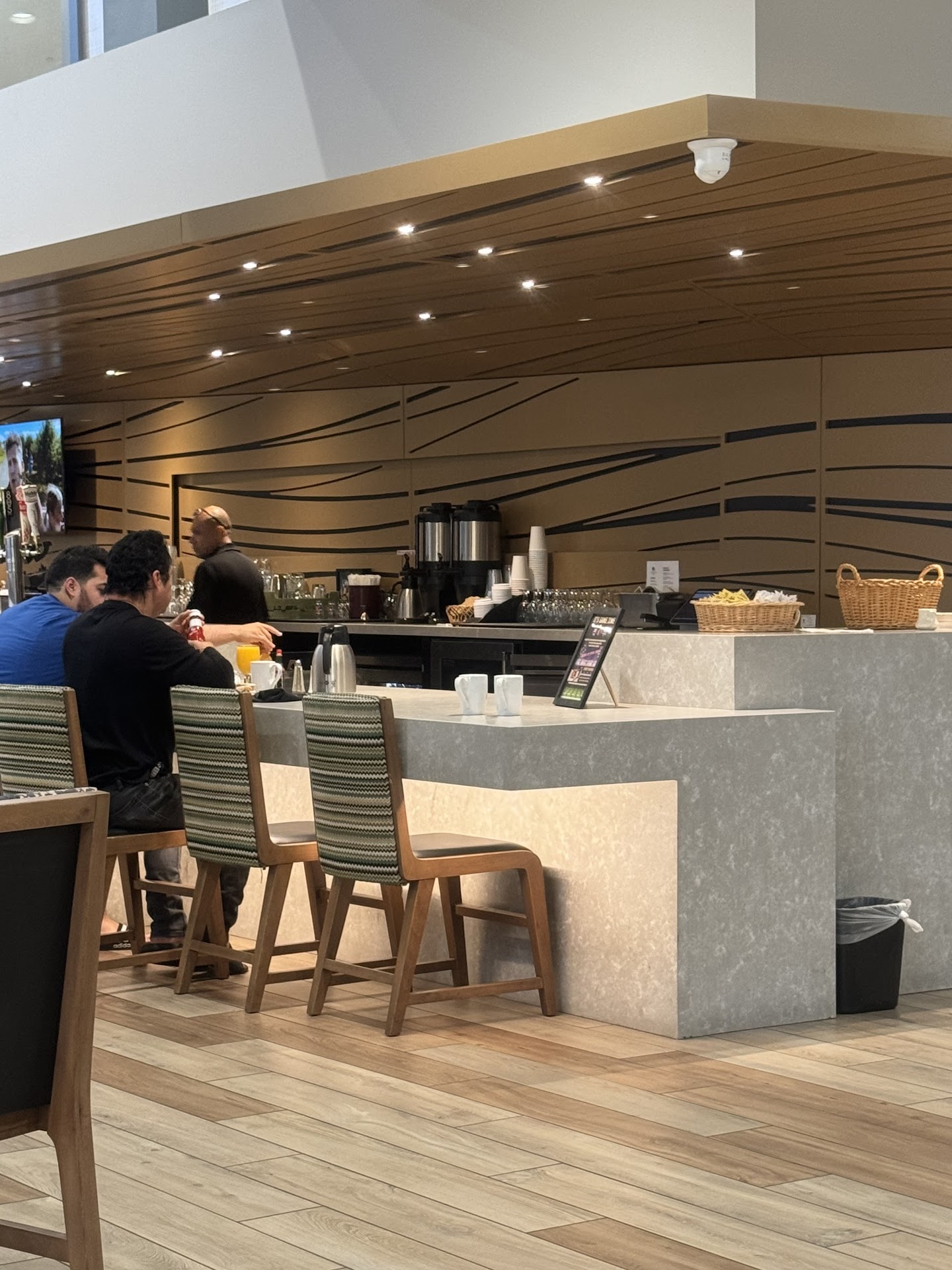 I had breakfast here while I was charging my EV at their infernal charging stations in the Marriott parking lot. I spent $31 for Belgian waffles with real whipped cream & very fresh strawberries, delicately scrambled eggs and good sausage (not those shriveled digits they serve elsewhere). It came with coffee and I must note, I was very impressed with their coffee. Maybe that's due to there being a Starbucks in the same lobby, I don't know because I dislike the burnt taste of Starbucks, but I take my coffee black and it was notably delicious. It's just breakfast... But I have travelled A LOT and let me tell you, you can mess up a simple breakfast 100 ways. This place gets it right even when the kitchen was about to close in 30mins. Jessica was my server, warm and congenial. I'm a local and I'm coming here for breakfast again. Count on it! (No pics because I cleaned...