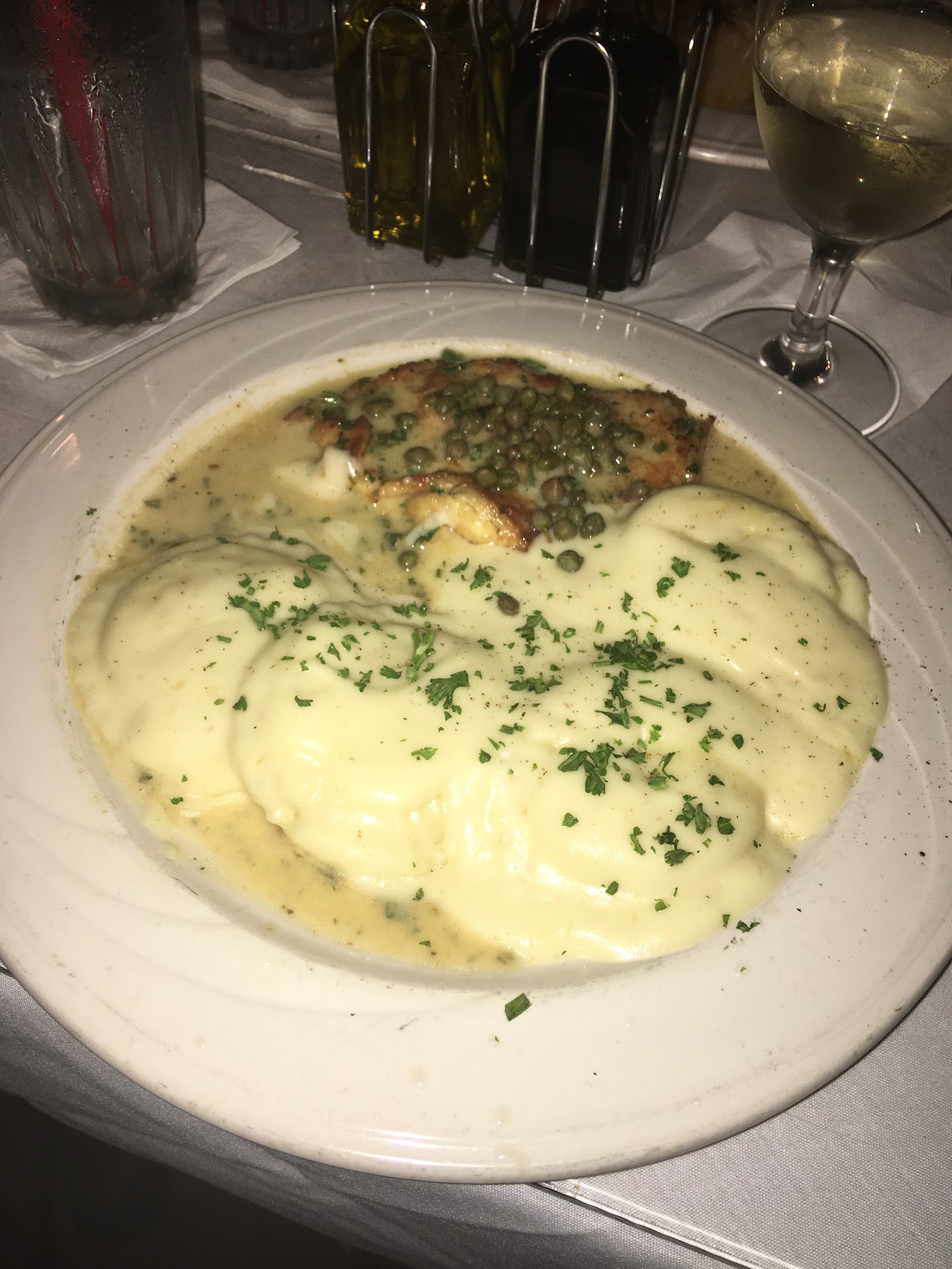 My food was excellent. I got the Chicken Picatta. The chicken was moist and flavorful. My mashed potatoes and vegetables were delicious too. For such a large group, no one had any complaints that their food was wrong or didn't taste good. I have never, at any other restaurant, with such a large group, have not one complaint about the food or service. We had 2 servers dedicated to our room. We never had to look for them for help. They were always attentive. Our water glasses were never empty, and we didn't have to wait long between cocktails.