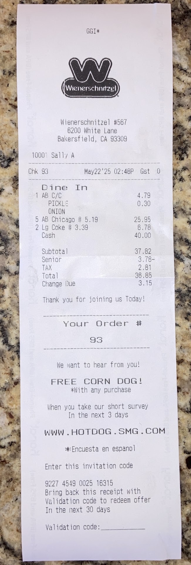 Today, May 22, 2025, at 2:48pm, was the first time that I have had poor service at this location on White Lane. We went into the dining room and I ordered six hot dogs. While ordering, I told the cashier three (3) times that I wanted all six hot dogs to be all-beef and also split and grilled. The order took a very long time, and by 3:04pm, when the order was brought to our table, none of the six hot dogs were split and grilled. I brought this problem to the attention of the manager (wearing a red shirt), and she said, âWell, the cashier probably didnât know what you meant by split and grilled.â I replied, "Then your worker, if confused, needs to let the customer know that they do not understand part of the order. I told her that Sally, the owner, never had a problem with our orders before. At first, I said I felt badly asking them to remake all of the hot dogs again, but after getting back to the table, my parter said that she wanted two of hers remade, which the workers did. There seems to be some lack of training here in which if a worker doesnât understand an order, they donât say anything about it, but simply omit that part of the order that they didnât understand. This is very dissatisfying to a customer who has paid about $40.00 for...