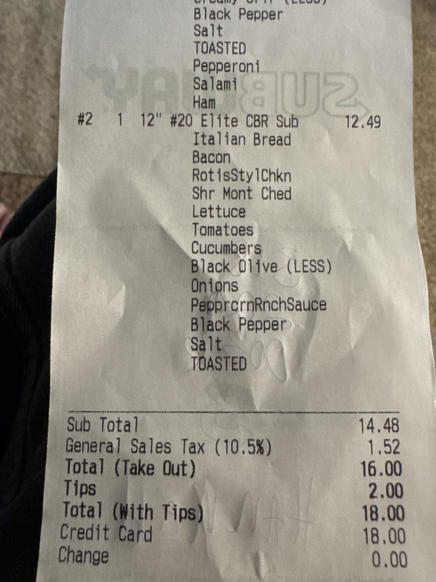 Read moreFirst time going to this place, place is falling apart on the walls but I excused that cause it looked like an older building. However what really got to me was the fact that both girls had no hair nets, one with short hair and the other braided. No hair nets whatsoever. Next the girl who made a sandwich for the man before me got ranch on her gloves from his sandwich then proceeded to touch mine with it. THEN cut my sandwich with a dirty knife that was also used to cut the manâs before me and also the people after me. No sanitation bucket in sight and no wipe down of the knife AND no changing of gloves. This is a big allergen concern, I should have looked at the reviews prior but was craving a subway sandwich. Now I remember why I donât go to any around here. No care for health regulations or health concerns. The people also seemed annoyed to be there and werenât that friendly. The best part about the place was the...