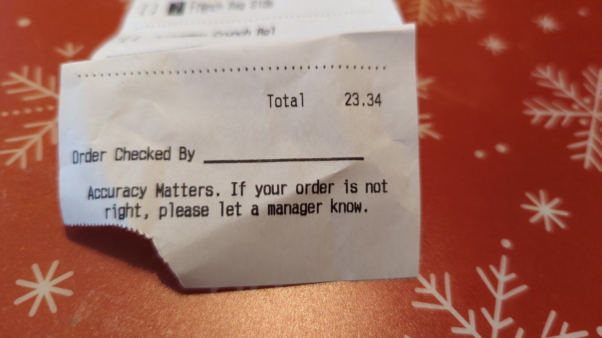 Read moreI'm changing my review from 2 to 5 stars. The last couple times I've been there order accuracy has been 100% and they're checking off the items on the receipt and signing the "checked by" now ... Thanks for the changes!! The location is getting 2 stars instead of 1 because most of their staff is extremely friendly. From Day One since opening - this location has been very challenged with order accuracy. I place order at a drive thru - I ensure order is accurate on the screen - and I get home and at least one thing is wrong 80% of the time (or likewise, order online). Most of the time - Including today - I find the "Order Checked By" not initialed or signed on the Receipt. This is right above a note that says "Accuracy Matters" (it clearly is NOT A PRIORITY at the location). After spending 10 minutes on hold - I got through to the manager ... She did her best with me because I was being difficult - the only options she gave me required returning : (1) to get the item they missed, or (2) to get a refund (they can't issue a refund on the phone). This is not the Manager's fault - but the store NEEDS a way of righting their wrong that doesn't require me to drive back (taking my time and expense of gas). Most locations will offer to mail free meal coupons ... She made it clear of my only two options ... And that wasn't one of them. Upper Management - please figure out how to empower your team members to provide CONVENIENT options when...