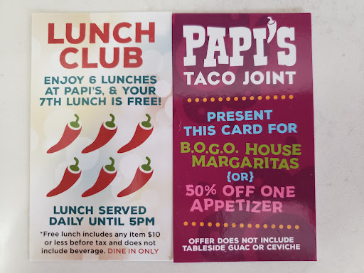 Read moreI tried several times with Papi's Soha. Papi's is a great franchise, but this location fails. 1st visit the tacos are not good, they are consumable. But I figured they just opened it will get better. 2nd time out was happy hour and wings. Wings were overcooked a couple with holes in the flesh. Guac is okay. 3rd time was a crime. My family and I walked here on a Monday for a stroll and dinner. Three hairs were found. Two in one dish, one in the other. I called the manager, informed her I was not paying for any of the food. The youngest had ate their very small, not appetizing to anyone else, tacos. I paid for our wings, we ate them, they seemed fresh. I also paid for our beverages in consideration of the waitress and tipped. I tipped although the waitress brought the wrong order several times. They tried to bill me for drinks ordered, but not served. I don't know if it was incompetence or audacity. A more accountable and hospitable manager would have comped everything. And yes this is going...