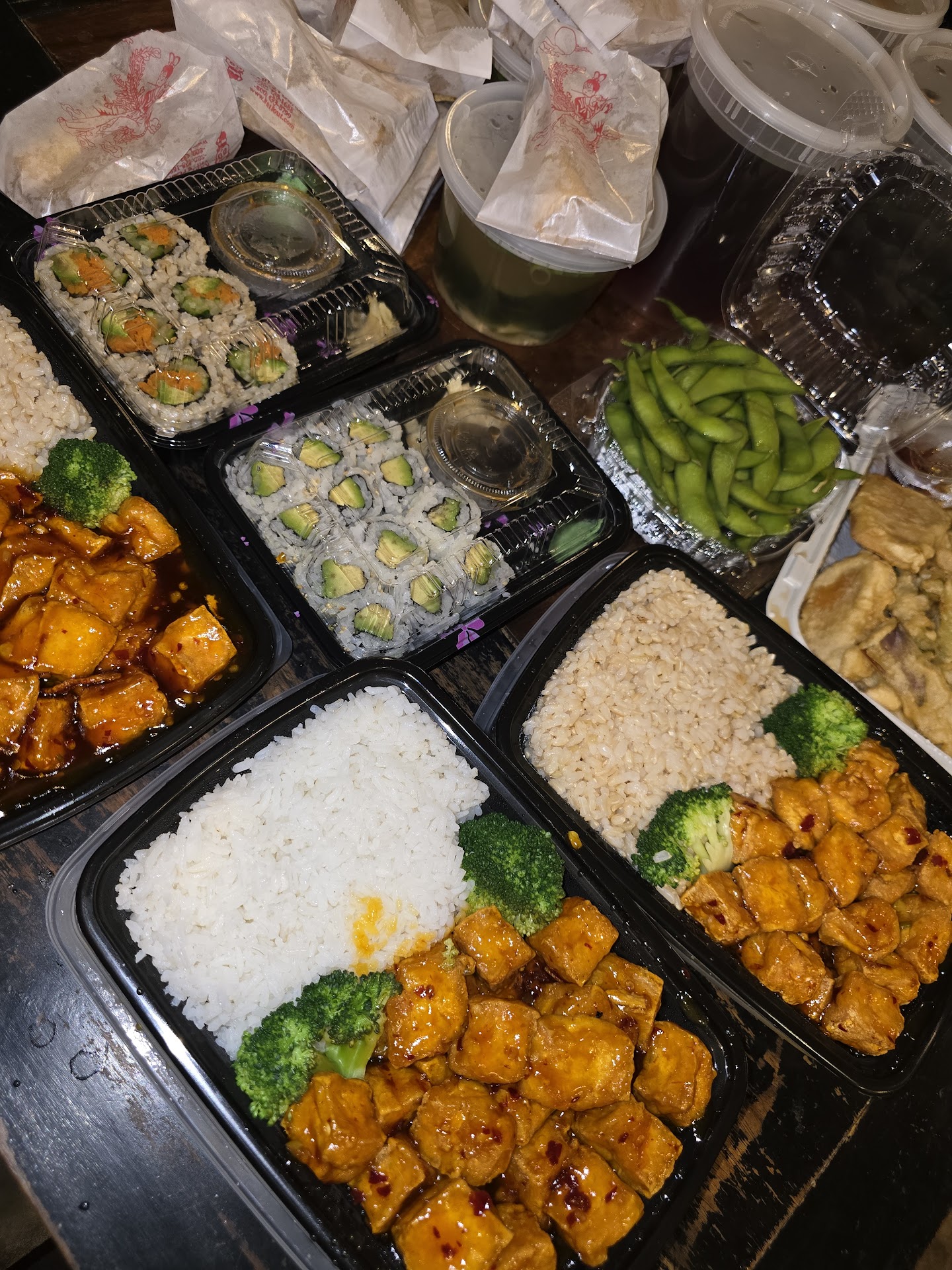 I ordered the General Tso's and Orange Tofu lunch/dinner, vegetarian and avocado rolls, miso soup, edamame, spring rolls, vegetable tempura, and half and half tea. I appreciate brown rice as an option. My family appreciates my new find, especially my daughter.