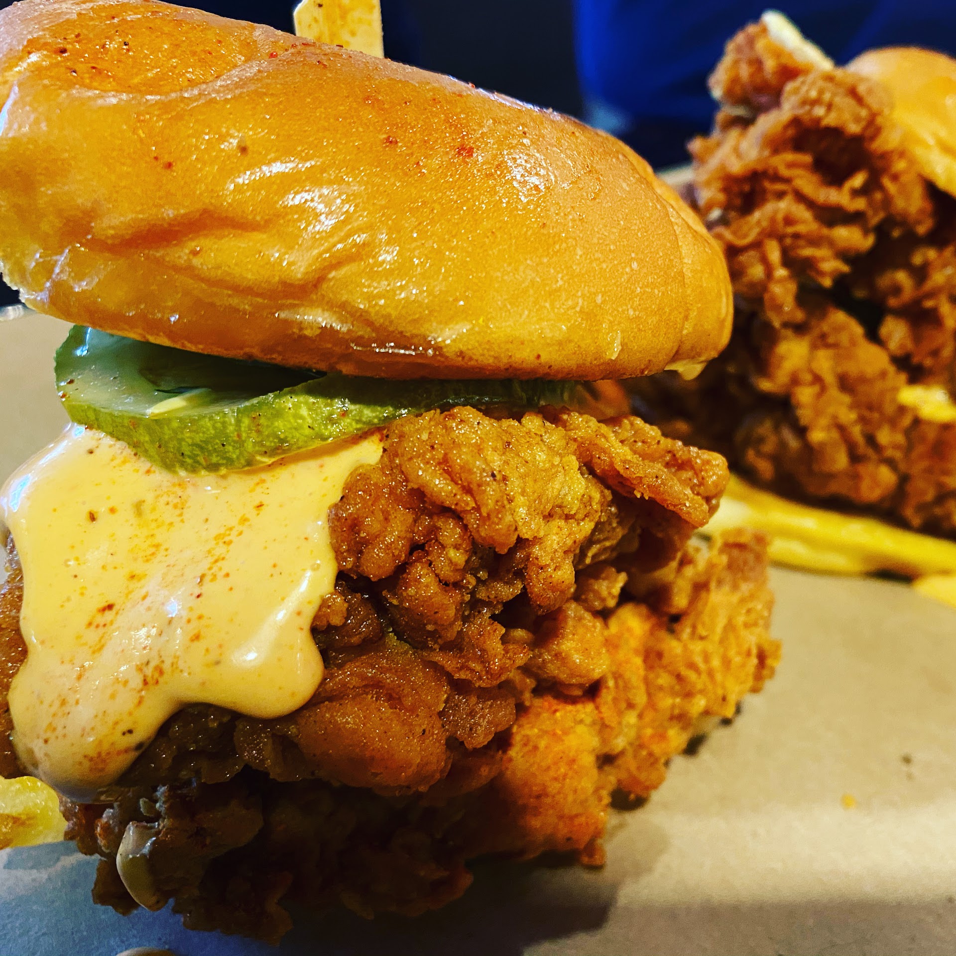 Read moreThis place used to have my favorite chicken sandwich in the world, absolutely unmatched. The fries? Still primo. My previous 2 visits were… really bad in terms of service, but the food was worth it. Service on this visit was fine. Unfortunately the quality has consistently gone down in the last 18 months, along with the portion sizes. The prices have gone up, however. :( My last sandwich was undercooked, the breading was mushy, their signature BRD sauce tasted notably different - like they switched their base out to the mayonnaise they have in a public school cafeteria and went lighter on the spice. Also, my bad for not looking so closely at the menu! But two 16 oz bottled half and half’s being $8 is a fughing joke. Legitimately, I have paid less than that in an airport, and I could have just walked to the 711 or Walgreens across the street and paid $5 less? I understand that the pandemic has been hard on a lot of places, but cutting corners and inflating prices like this is just...