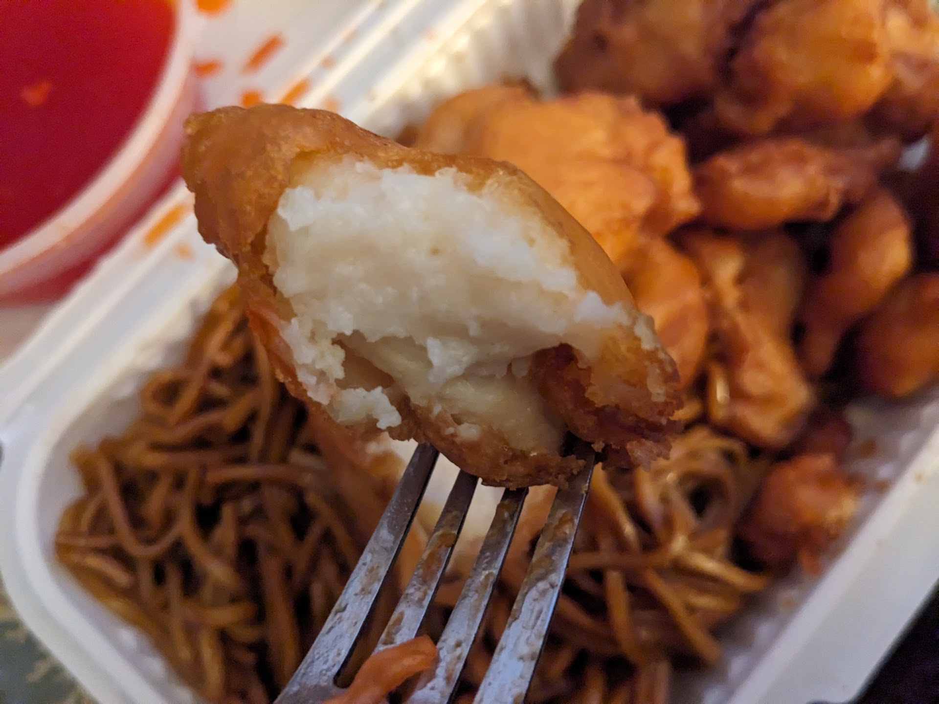The food itself was awful. I can't figure out exactly what's wrong with the rice, but everyone agreed that there was something off about it - it was mushy without being sticky, and had an odd taste. The orange chicken was bland - barely tasted the orange, the sauce was watery rather than thick, and the coating was not crispy at all - more like barely cooked soggy flour. My boyfriend's chicken was so overcooked he could hardly chew it. I ended up tossing tha practically full container in favor of a vending machine meal. It was not that cheap either - complete...