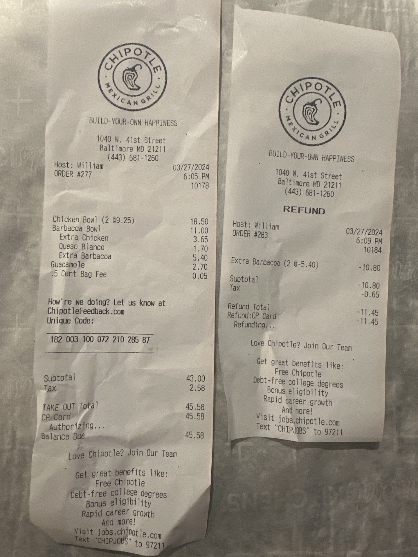 My experience with Chipotle at multiple locations has taken a drastic plunge over the last year. But this location is closest to my normal routine and the one I tend to utilize the most. A few months ago, I arrived to pick up my online delivery and at least 3 staff members who were not assisting other people (they were making online orders) didn't even look at me to acknowledge my presence. They were standing within 5 ft of me so it was impossible for them to not see me. I looked back and forth from employee to employee with no response. This went on for at least 5 minutes before finally someone made eye contact and asked why I was there. I also have, multiple times, ordered delivery through them and received the COMPLETELY wrong order. I once received 3 Snapple bottles instead of my food. A few times I ordered Chips & Queso and they weren't delivered because the location was all out...so instead of refunding me money (which Chipotle NEVER does when they make a mistake) they gave me Free chips & queso on the app. Guess what they didn't have the next time I went in to use my coupon....you guessed it, all out of chips again. 80% of the time I go in there they are out of chips. It's like they stop making them at a certain hour even though I'll be in there or ordering HOURS before they close. Then the next time I went to get the free chips & queso they finally had them but my coupon had expired by a few days and they wouldn't accept it. Keep in mind they mess this up so much I have more coupons than I can possibly use before they expire given they never have what the coupon is for and Chipotle as a company refuses to refund actual money. I've been in customer service for 17 years and I rarely go out of my way to write a bad review because I know how rough the service industry can be. But come on, it's so obvious they dont value their customers' experience or money. I am running out of good things to say about them...
