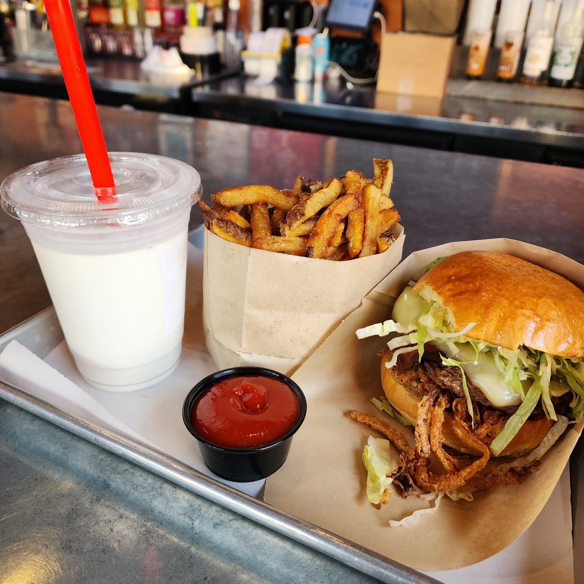 Continuing my quest to find the best burger in Baltimore and this took my new number one spot! I went with the staff recommendation of a Clark burger with crispy onions instead of raw and then I got regular fries and a vanilla shake. It was a struggle not finish my shake while waiting for my food. Sweet and surprisingly light. When my order arrived, I first tried the fries. A good solid real potato fry with flecks of salt that was delicious dipped into my shake or paired with kethup. My friend had the garlic Parm fries which also did not disappoint. Onto the burger... the first bite was amazing. All the flavors and textures melded together perfectly in my mouth. I'm usually not crazy about bacon on burgers, the texture usually stands out too much or it's rubbery or the flavor overwhelms the rest of the burger but the bacon on the Clark burger fit in perfectly. The shredded lettuce was a crisp fresh addition, leaf lettuce makes a burger fall apart and slip and slide too much in my opinion. Then there was the pickles, crisp crunch, added tang, and stayed put when you bite into the sandwich. The Clark sauce? Amazing! Crispy onions? Always a fav. And those buns! Gosh a sturdy bun is so important to my enjoyment of a burger and these buns delivered! And the smash patty, the star that brought the whole thing together, perfectly cooked and seasoned. When I didn't think it could get any better, I mentioned how I love bbq sauce on a burger and the staff brought me some. Elevated the whole experience and brought the sweet to the savory which is my favorite flavor combo. I happily finished my burger and shake, and was definitely over ambitious with the large fry which I took most of home. I was full, but not bloated, sometimes a burger, shake, and fries leaves you feeling heavy but I felt good after this.
