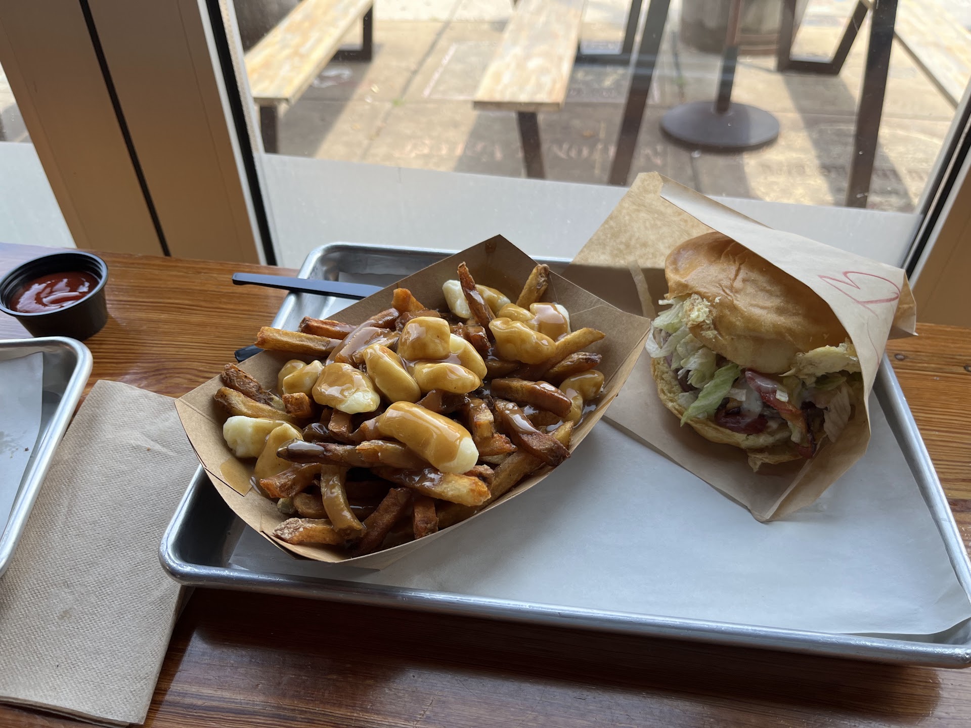 The food is really, really good. The burgers are amazing. The ingredients are well thought out and work well together. The burger patty was very flavorful. The dill pickles I had on my burger (which was the brisket one) were really good, and I miss them. We got the regular poutine, and it was perfect. The fries are boardwalk style, the gravy was very tasty, and the cheese curds were cold and melted with the gravy. The prices are really fantastic for the amount of food you get, and the quality. Plus, the coke comes from the spout or whatever it's called at the bar and it is AMAZING! There is alcohol, which I did not have, but I will one day! Plus there's boozy milkshakes! I can't wait to return and try something new.