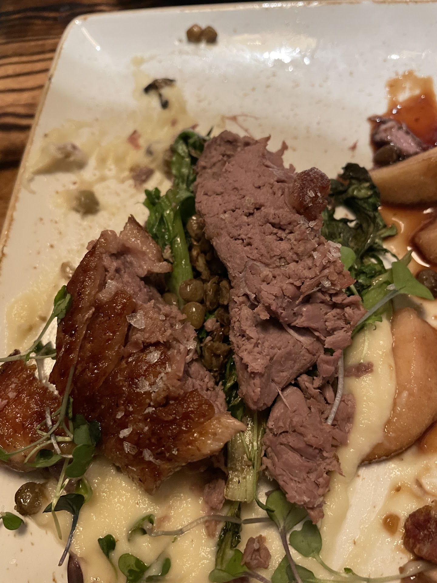 The duck duo wasn't the worst since neither the leg nor breast were badly cooked, but for a $39 plate, it was pretty unacceptable. đ The lentils and kale had no seasoning, the "fois gras vinaigrette" (zhush #4) tasted like an overly bitter balsamic reduction (if there was fois gras in it, it was a waste of duck liver đ), and I don't quite know what the white sauce was supposed to add to the plate. It was mildly buttery/lemony, but very bland more than anything else.